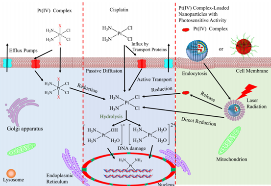 该研究结果为当前具有光敏活性的铂(IV)复合物纳米颗粒治疗癌症的研究指明了方向,并系统地介绍了铂(IV)复合物纳米颗粒为实现低耐药性、低生物毒性、药物释放和成像引导治疗而应具备的化学结构和理化性质,推进了该类药物实际应用于临床治疗的研究进程。
