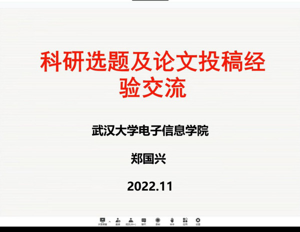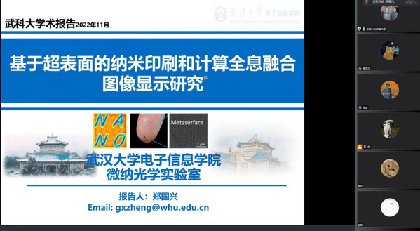 武科大网讯(通讯员李航为加强学术交流与合作,指导学生进行科学论文写作。11月10日,我校机械学院有幸邀请到武汉大学电子信息学院郑国兴教授作学术交流。本次报告会采取线上会议的形式,报告的题目是《基于超表面的纳米印刷和计算全息融合图像显示研究》和《科研选题及论文投稿经验交流》,由我校冶金装备及其控制教育部重点实验室、机械传动与制造工程湖北省重点实验室和精密制造研究院共同主办,机械学院陶波副教授主持本次报告会,一百余名师生参与了此次报告。