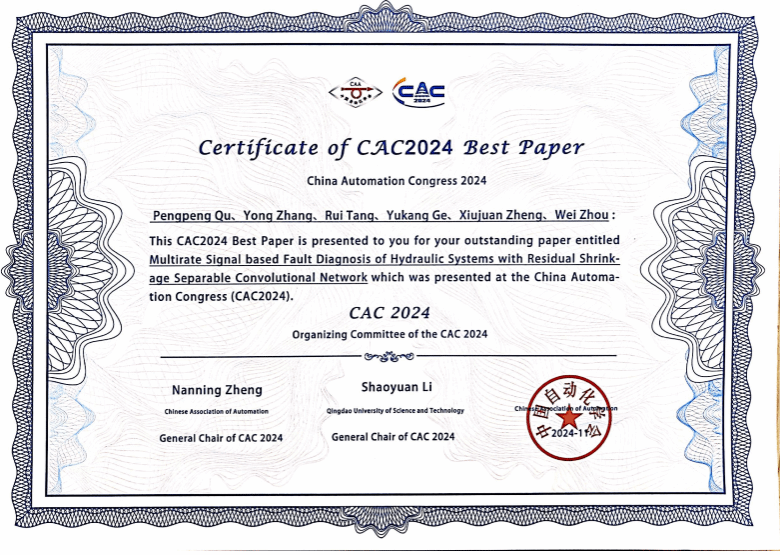 武科大网讯 近日,在山东省青岛市举行的2024中国自动化大会(CAC2024)上,我校人工智能与自动化学院硕士生屈鹏鹏和博士生周炜在张永教授的指导下合作的论文《Multirate Signal based Fault Diagnosis of Hydraulic Systems with Residual Shrinkage Separable Convolutional Network》,荣获CAC2024最佳论文奖。大会共接收论文1500篇,评选出12篇最佳论文。