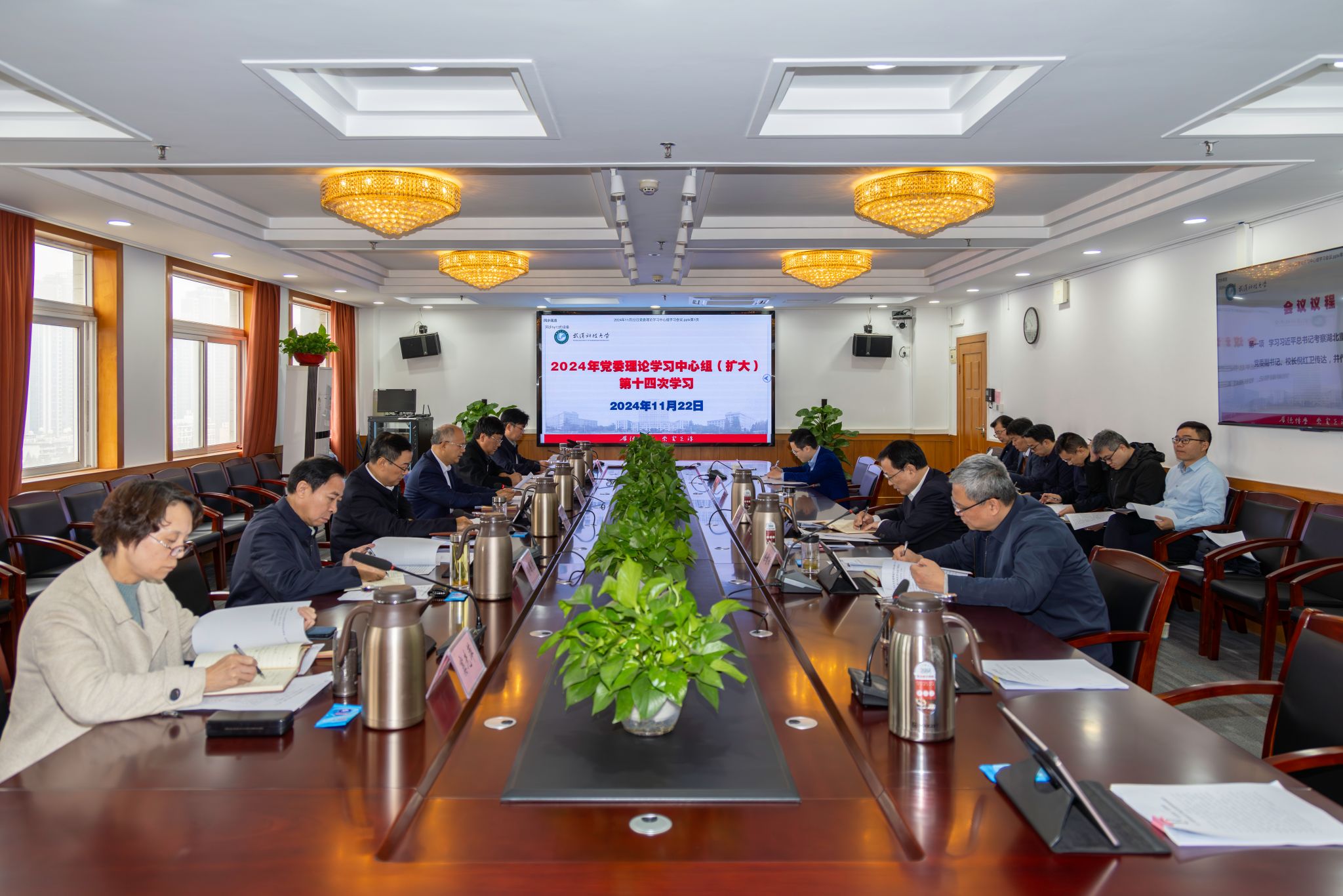武科大网讯 11月22日,学校在青山校区主楼1610会议室举行2024年党委理论学习中心组(扩大)第十四次学习,党委书记徐雁冰主持学习会议并讲话。党委副书记、校长倪红卫和全体在校校领导参加学习。
