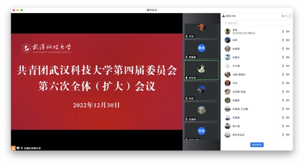 武科大网讯(通讯员张曦 记者叶显伟)12月30日上午,我校共青团第四届委员会第六次全体(扩大)会议召开,校党委副书记孙国胜、校团委全体委员、各分团委(团工委)书记通过腾讯会议线上参加。会议由校团委书记刘晓云主持。