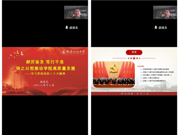 武科大网讯(通讯员李祥松)12月8日,校党委副书记盛建龙以《踔厉奋发 笃行不怠 持之以恒推动学院高质量发展》为主题,通过云端的方式,为机械学院领导班子、教师党支部书记、学生党支部书记、学生代表等230余人作了党的二十大精神宣讲报告。机械学院院长曾良才、机械电子工程系教工党支部书记钱新博、本科生党支部书记代表郭志楠、研究生党支部书记代表黄志兴相继发表交流学习体会。机械学院党委书记余淑均主持会议。