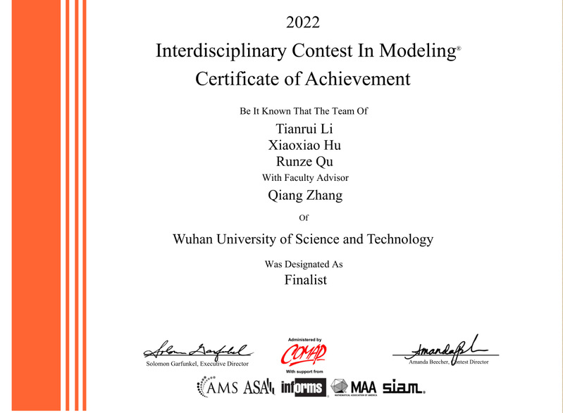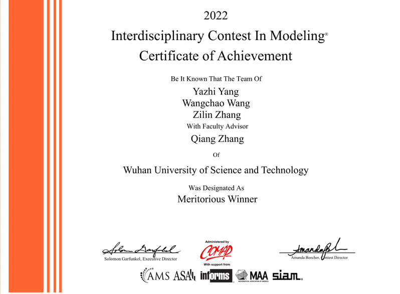 武科大网讯 近日,2022年美赛获奖名单公布,在此次竞赛中,我校数据分析与建模协会本科生共计荣获特等奖F1项,一等奖M1项,二等奖H5项。
