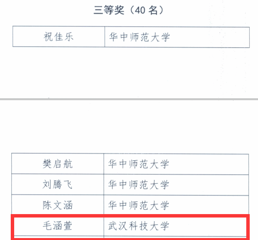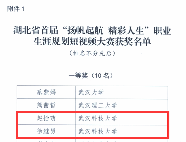 武科大网讯 近日,湖北省首届大学生职业生涯规划短视频大赛获奖名单公布,我校赵怡萌、徐继男两位同学获一等奖,毛涵萱同学获三等奖。