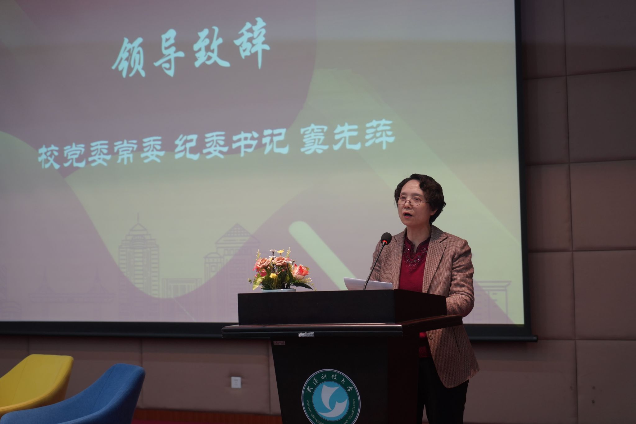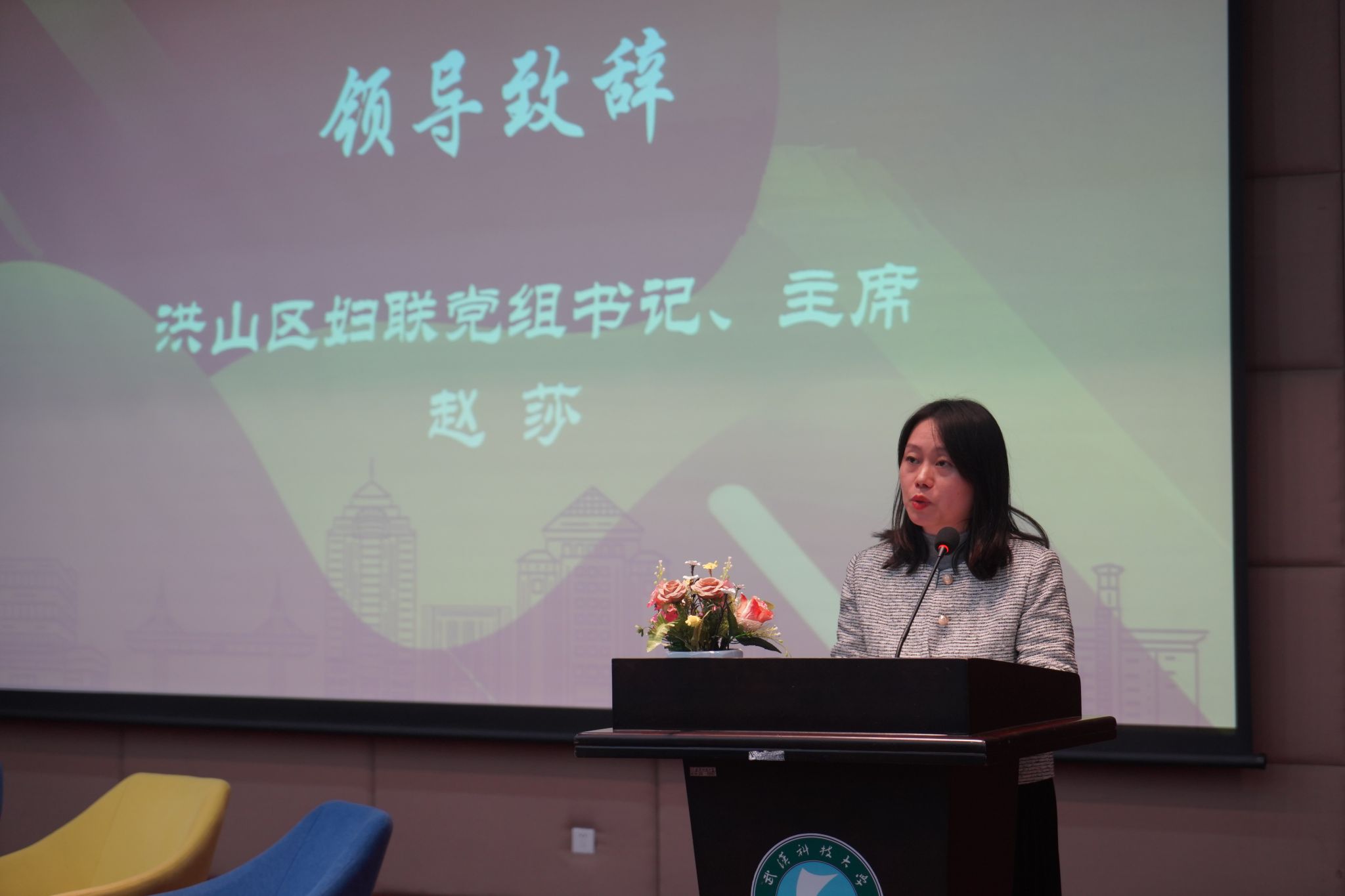 赵莎致辞,她表示此次访谈活动,是校妇委会落实湖北省妇联“科技创新巾帼行动”的重要举措,是立足新形势新起点加强对大学生的思想政治引领,培养造就更多时代新人的一次创新之举。洪山区妇联组织将进一步强化责任担当,搭建科创平台,优化联系服务,充分激发科技“她”力量,助力女性科技人才在新时代实现新发展。
