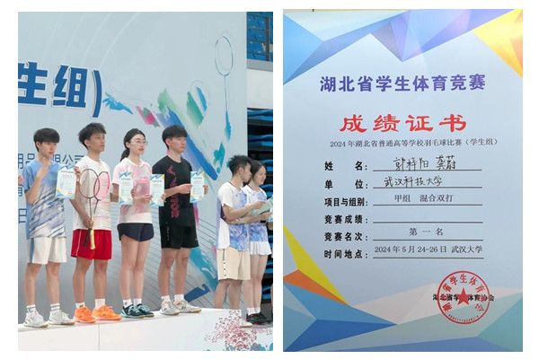 武科大网讯(通讯员平洋)5月24-26日,2024年湖北省普通高等学校(学生组)羽毛球比赛在武汉大学举行,我校学生获甲组混合双打冠军。