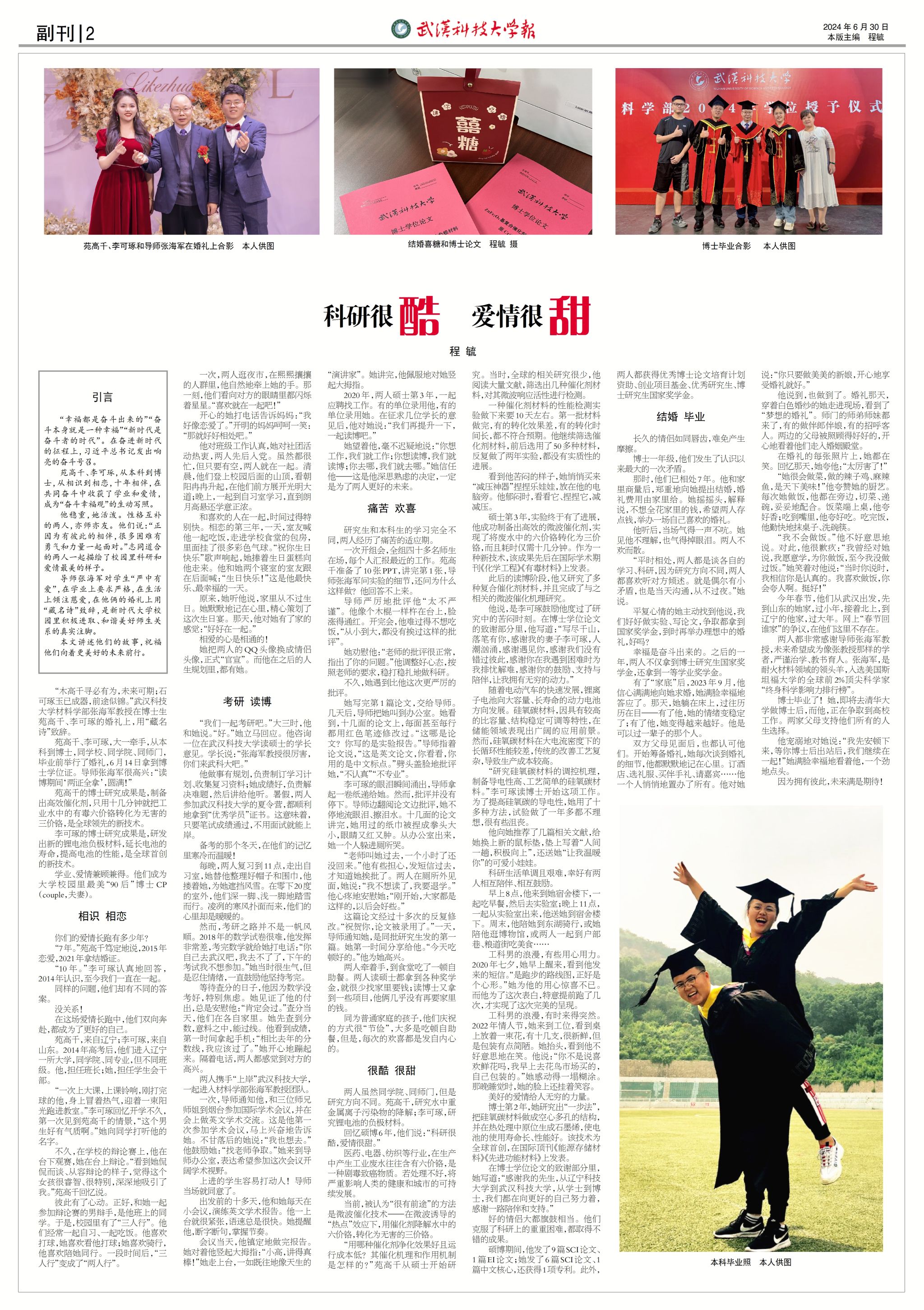 苑高千、李可琢,大一牵手,从本科到博士,同学校、同学院、同师门,毕业前举行了婚礼,6月14日拿到博士学位证。导师张海军很高兴:“读博期间‘两证全拿’,圆满!”