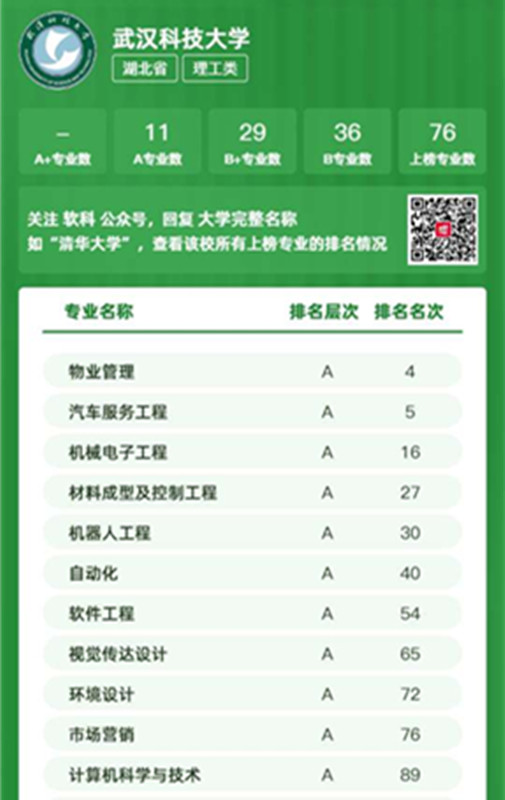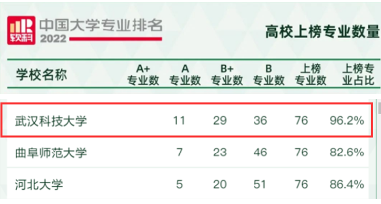 武科大网讯(记者李芳)6月18日,软科发布2022中国大学专业排名,我校76个专业上榜,11个上榜A专业,上榜专业占比96.2%。我校A专业数和上榜专业占比居湖北省属高校第一。