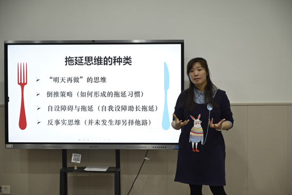 3月17日晚,“面对拖延症”团体辅导活动在我校黄家湖校区心理健康中心如期开展。国家二级心理咨询师孙蕊芳作为指导者,与其他八名参与者共同构成了一次单元体验团体。本次活动通过现场讨论以及孙蕊芳的理论指导,增加了参与者对拖延症的认知,每个人都在交流学习中提出了自己的问题,并相互学习分享经验。(熊雄)