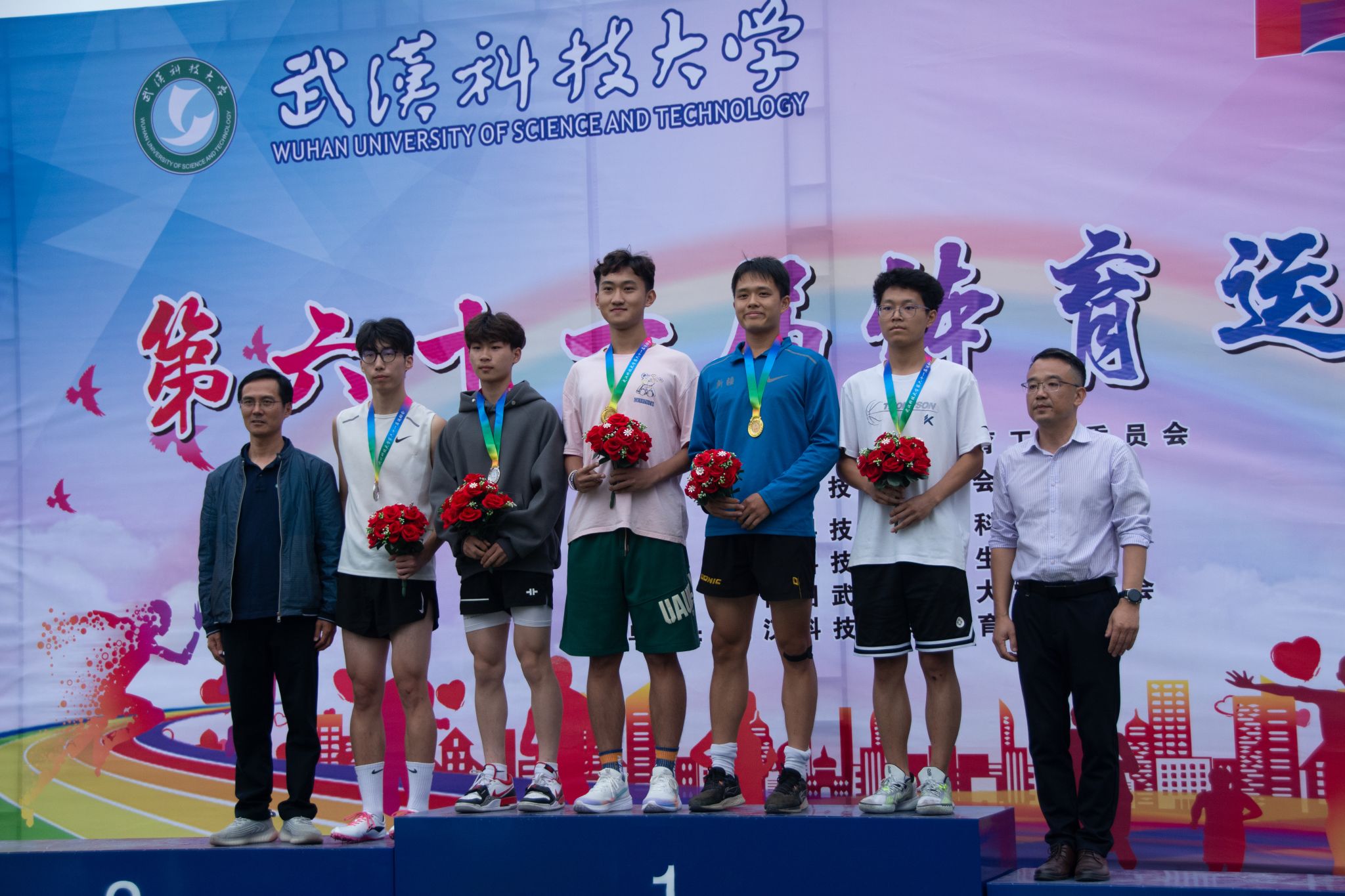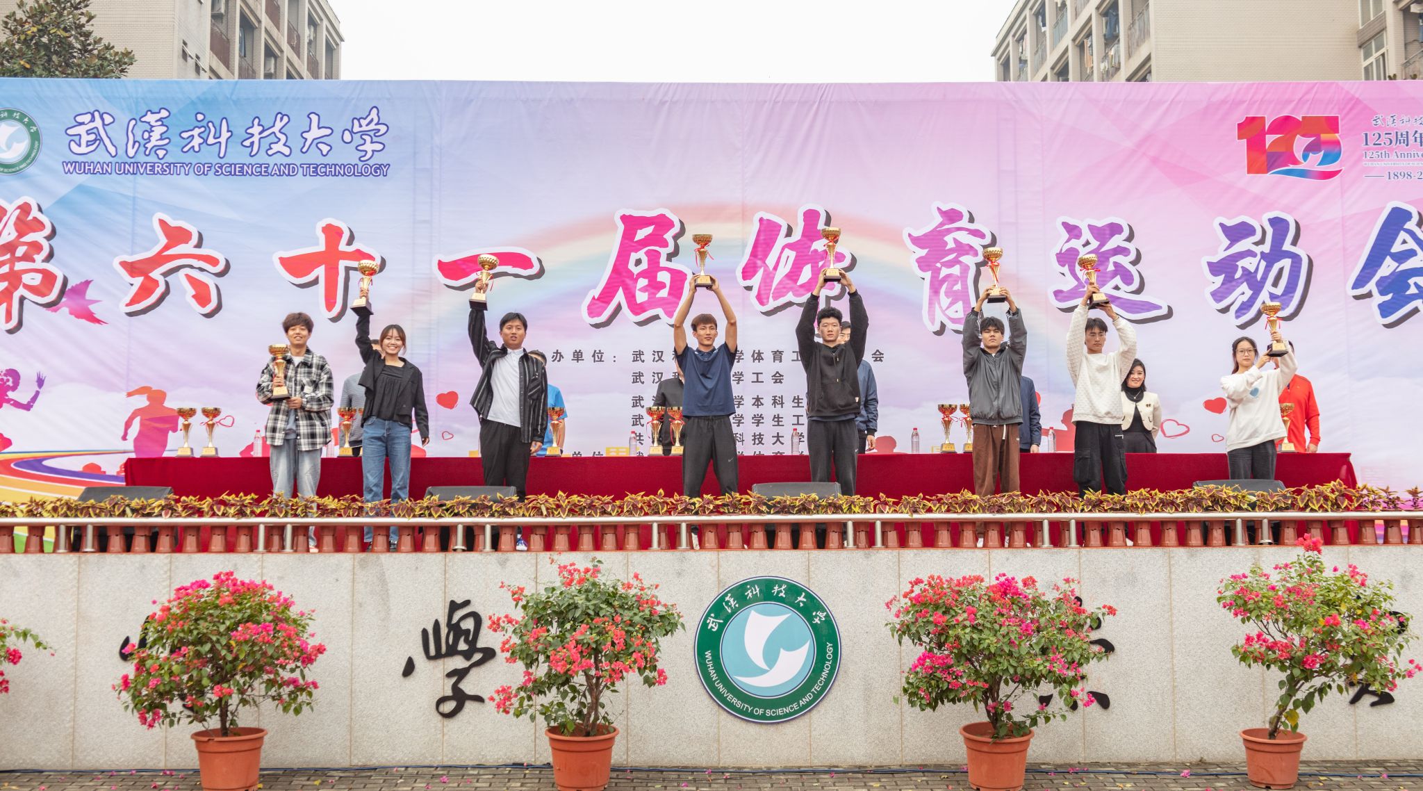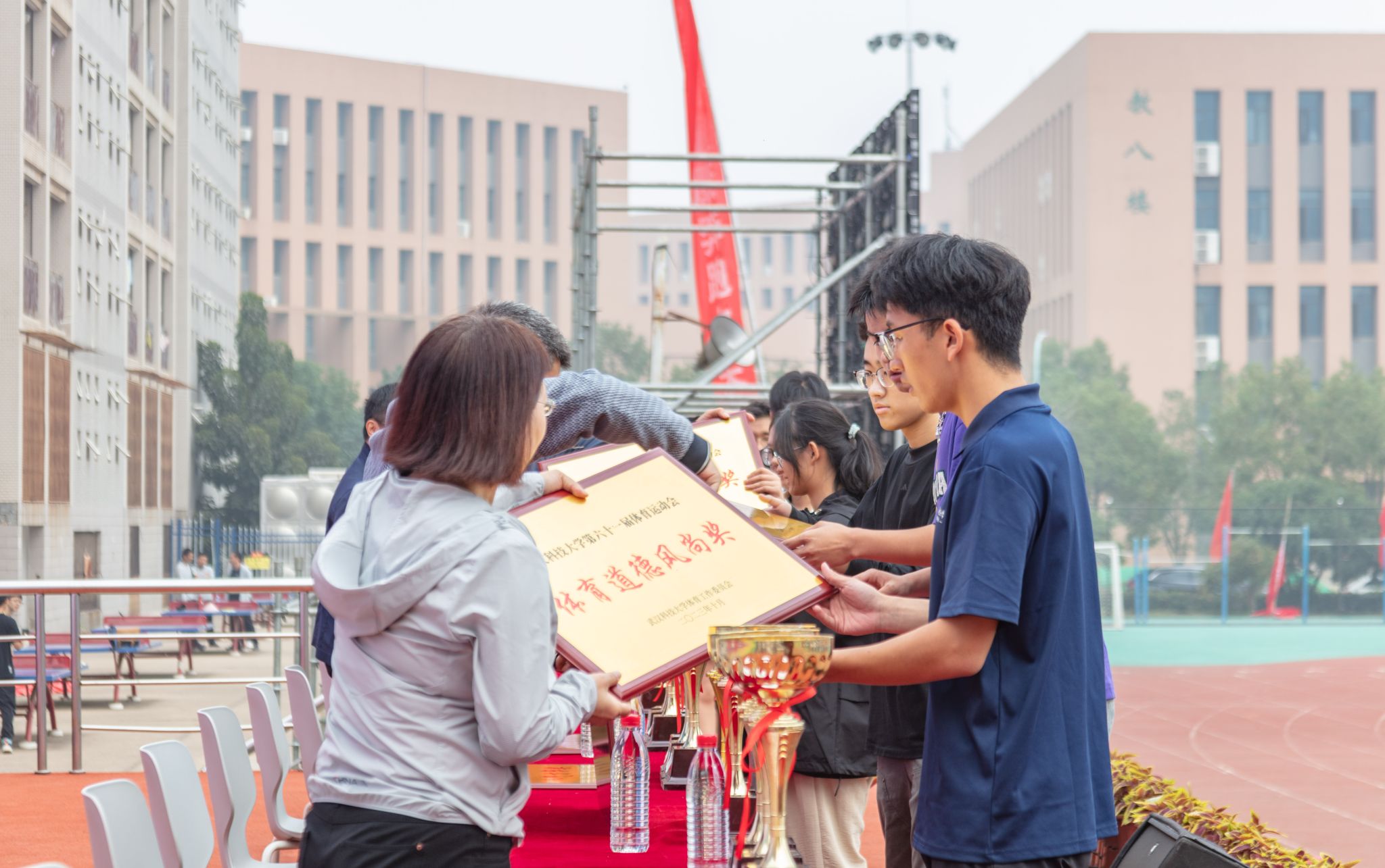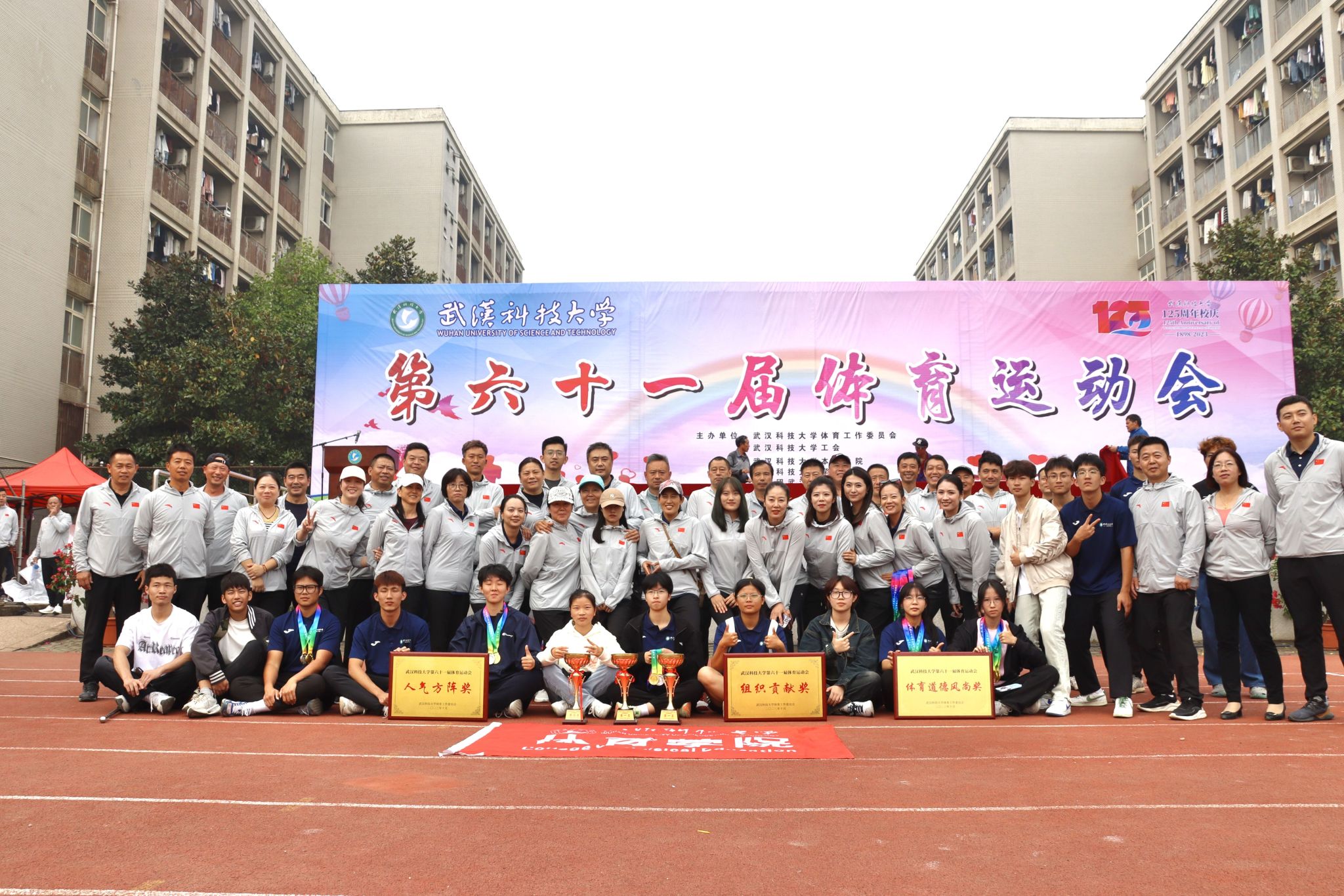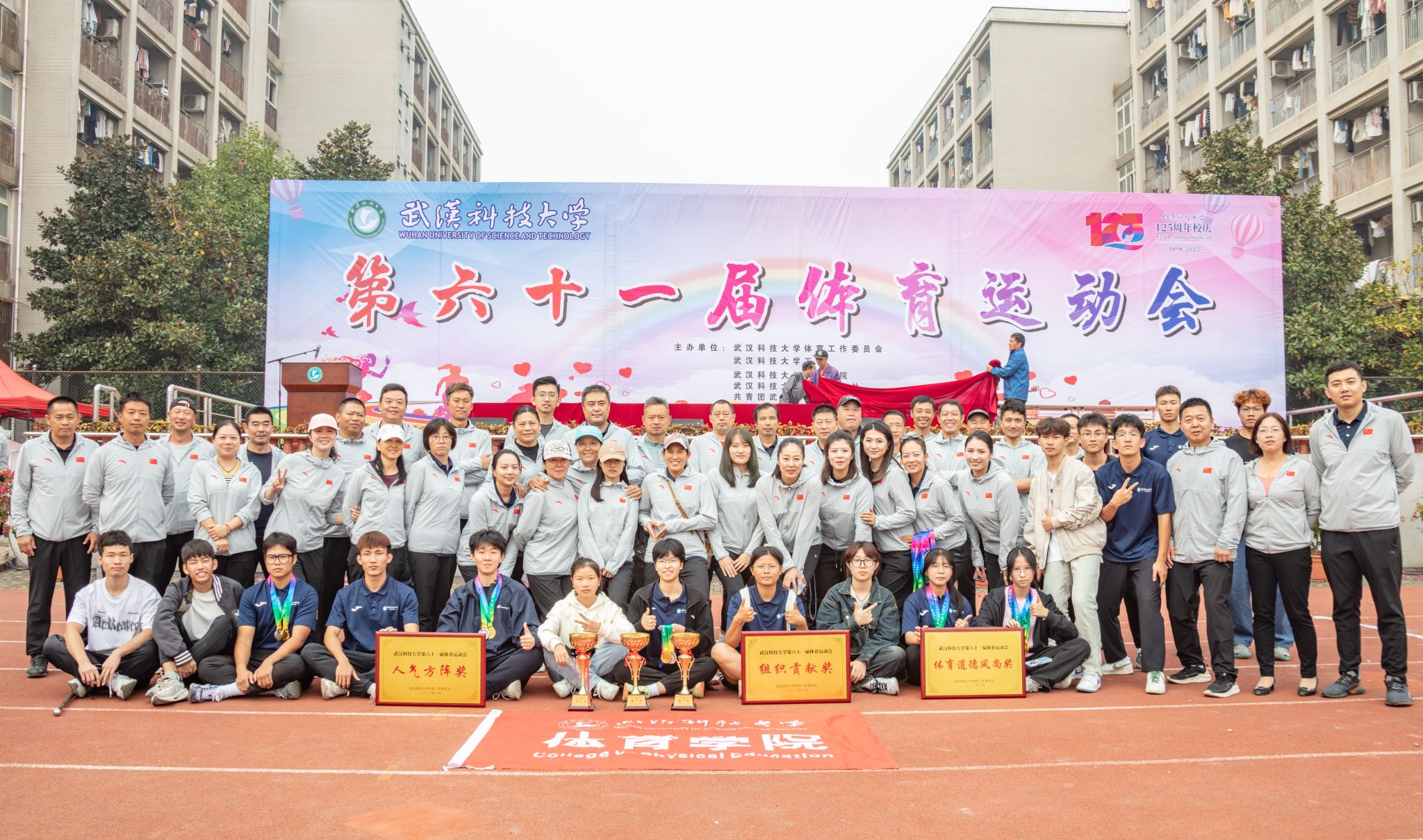10月28号上午十一点,我校在南苑操场举行第六十一届体育运动会闭幕式。闭幕式上,第一项由运动会赛事主管敖德江宣布竞赛结果,第二项学生工作处处长许立桥老师宣布“体育道德风尚奖”评比结果,第三项体育学院副院长王路遥老师宣布“组织贡献奖”获奖单位,第四项党委宣传部常务副部长饶红亮老师宣布“最美人气方阵”,第五项为领奖仪式。颁奖结束后,老师团体以及学院方阵合影留念。(潘梦颖)