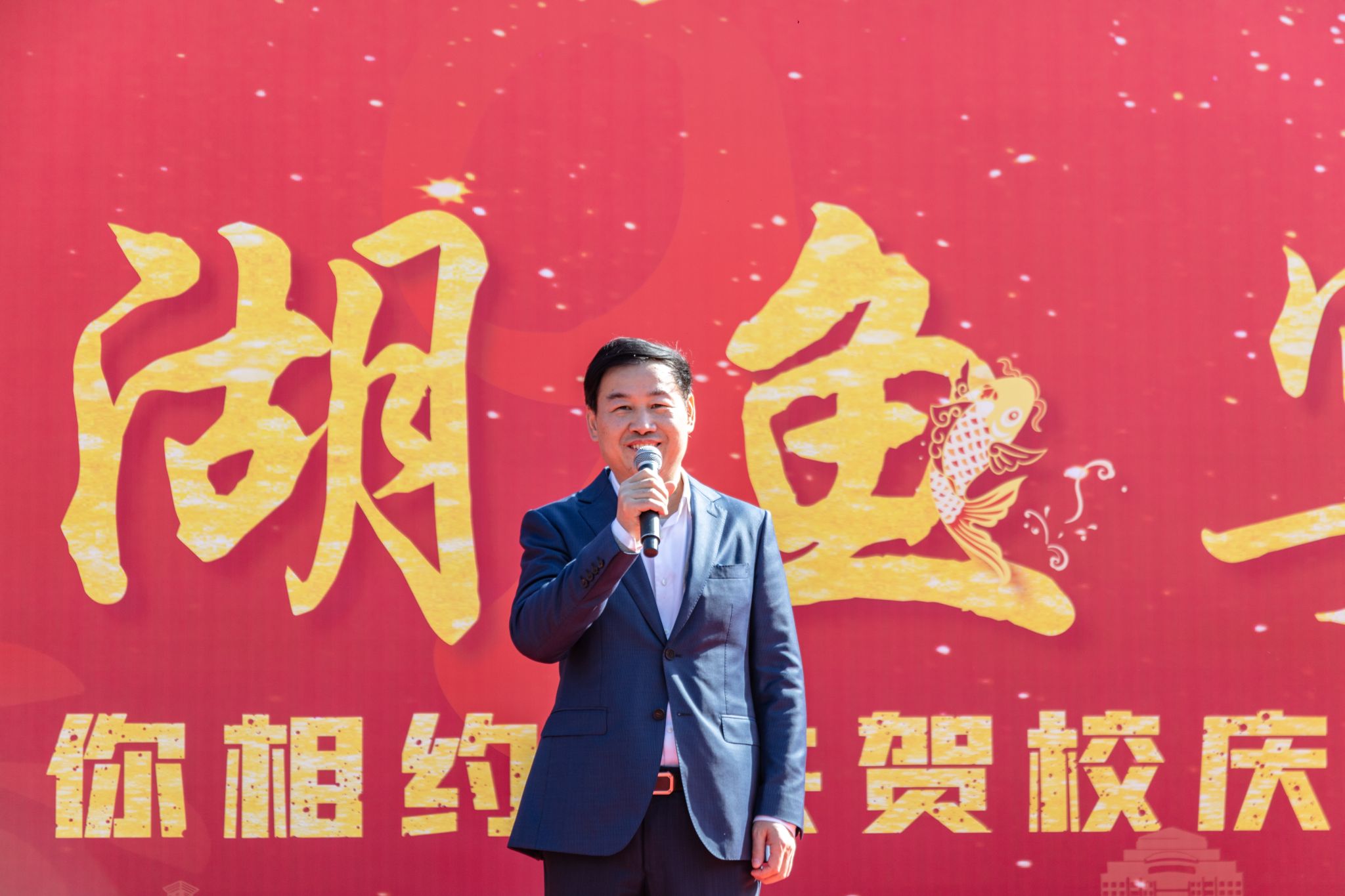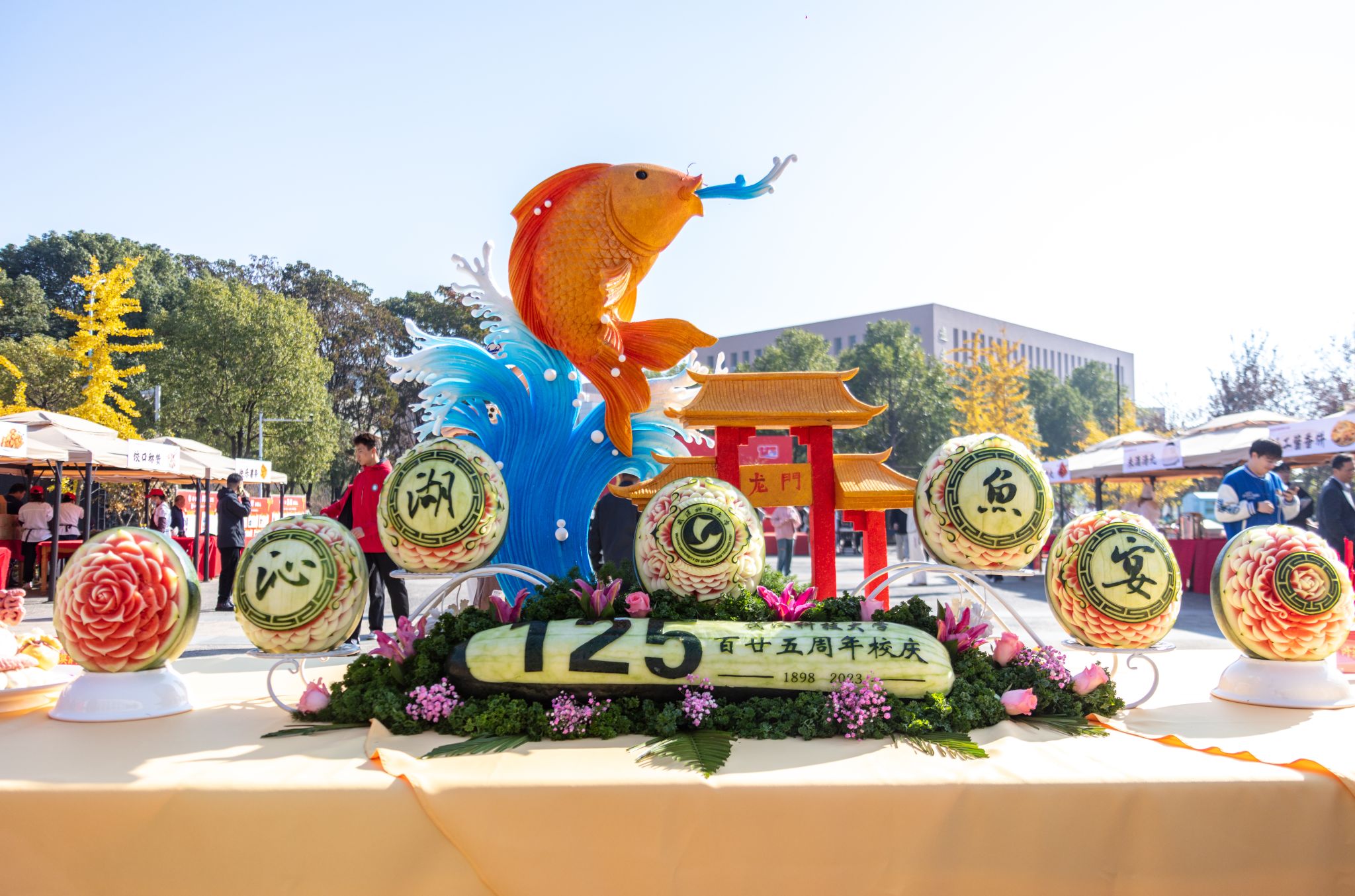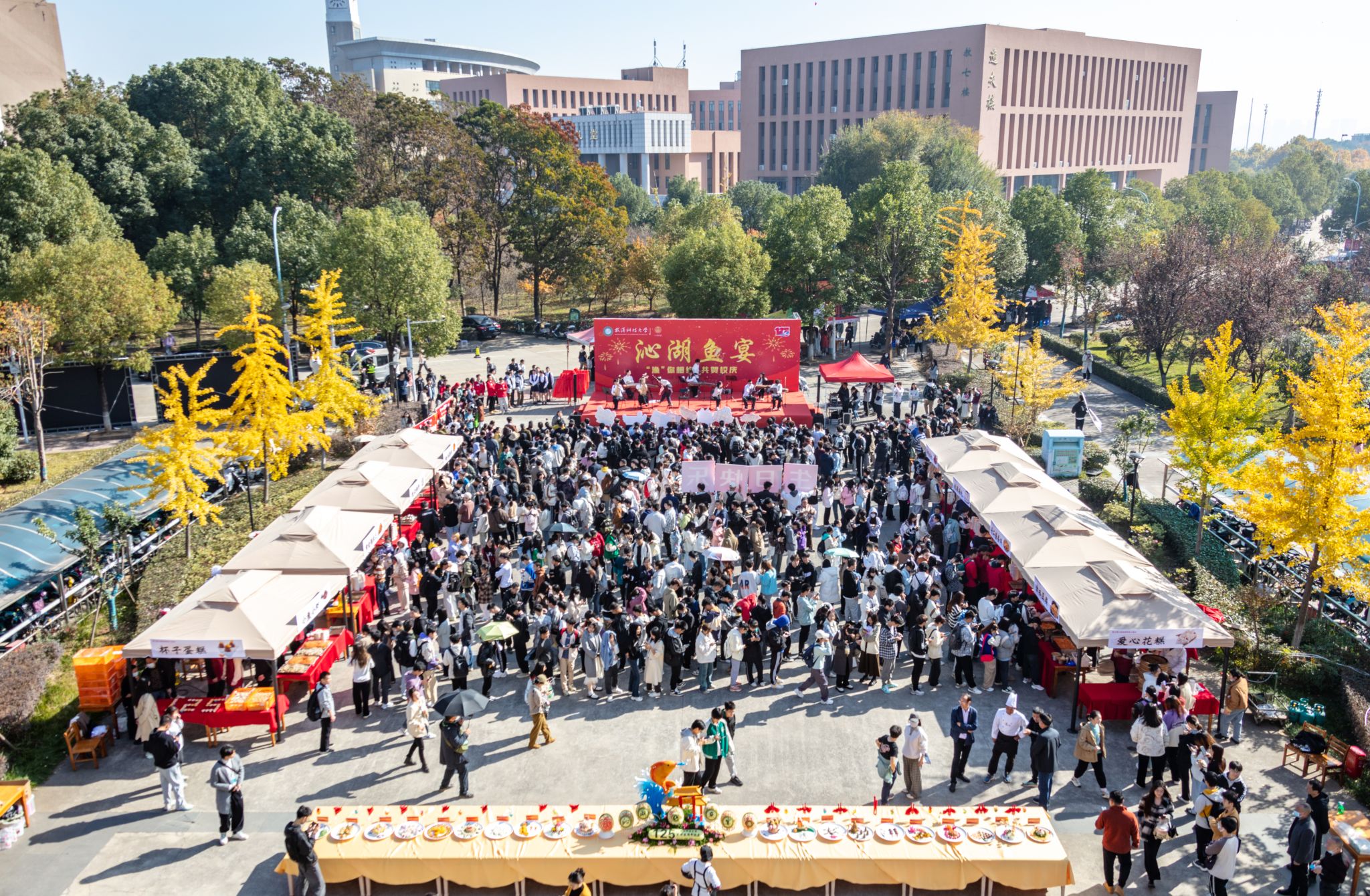 11月21日,我校在南苑食堂广场举行了第九届沁湖鱼宴。本届沁湖鱼宴恰逢建校125周年校庆,校党委书记徐雁冰,校长倪红卫,党委副书记孙国胜,副校长沈季伟出席开幕仪式。党委副书记孙国胜同副校长沈季伟一起为新版校徽,沁湖主题文化标识和校园文化系列丛书揭幕。并为校徽及文化标识设计者,艺术与设计学院副教授王伟老师颁奖。在校长倪红卫致辞后,校党委书记徐雁冰为今年的捕鱼王颁奖并宣布第九届沁湖鱼宴开幕。沁湖鱼宴是我校本着"共建美丽校园,共享建设成果"这一理念,2015年开始精心打造的校园文化品牌,全校师生来到鱼宴现场贺校庆、品鱼宴、逛庙会,在一年一度的“沁湖鱼宴",不仅能吃鱼,更能亲手捕鱼、烹鱼。(高文帅 韩子萱)