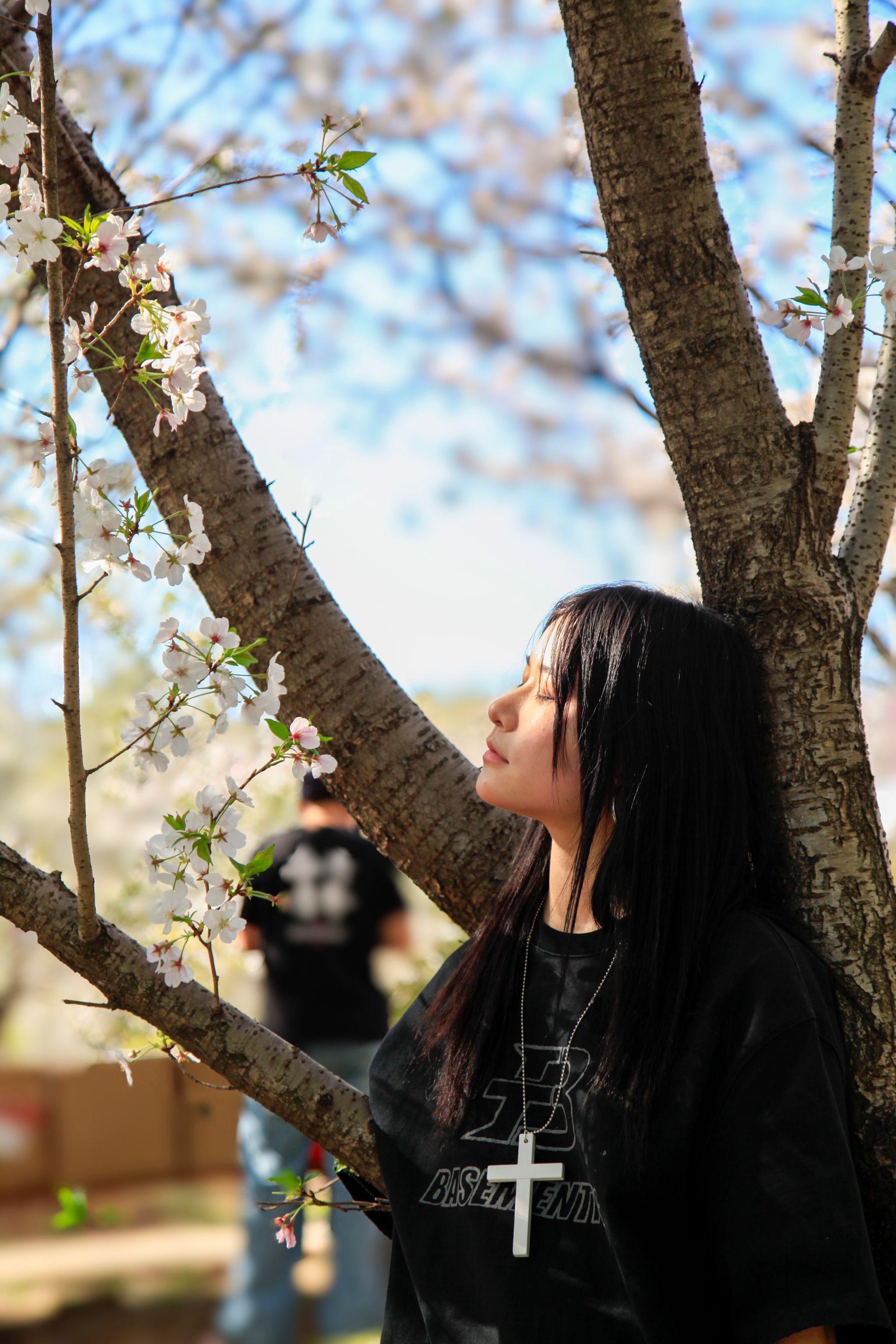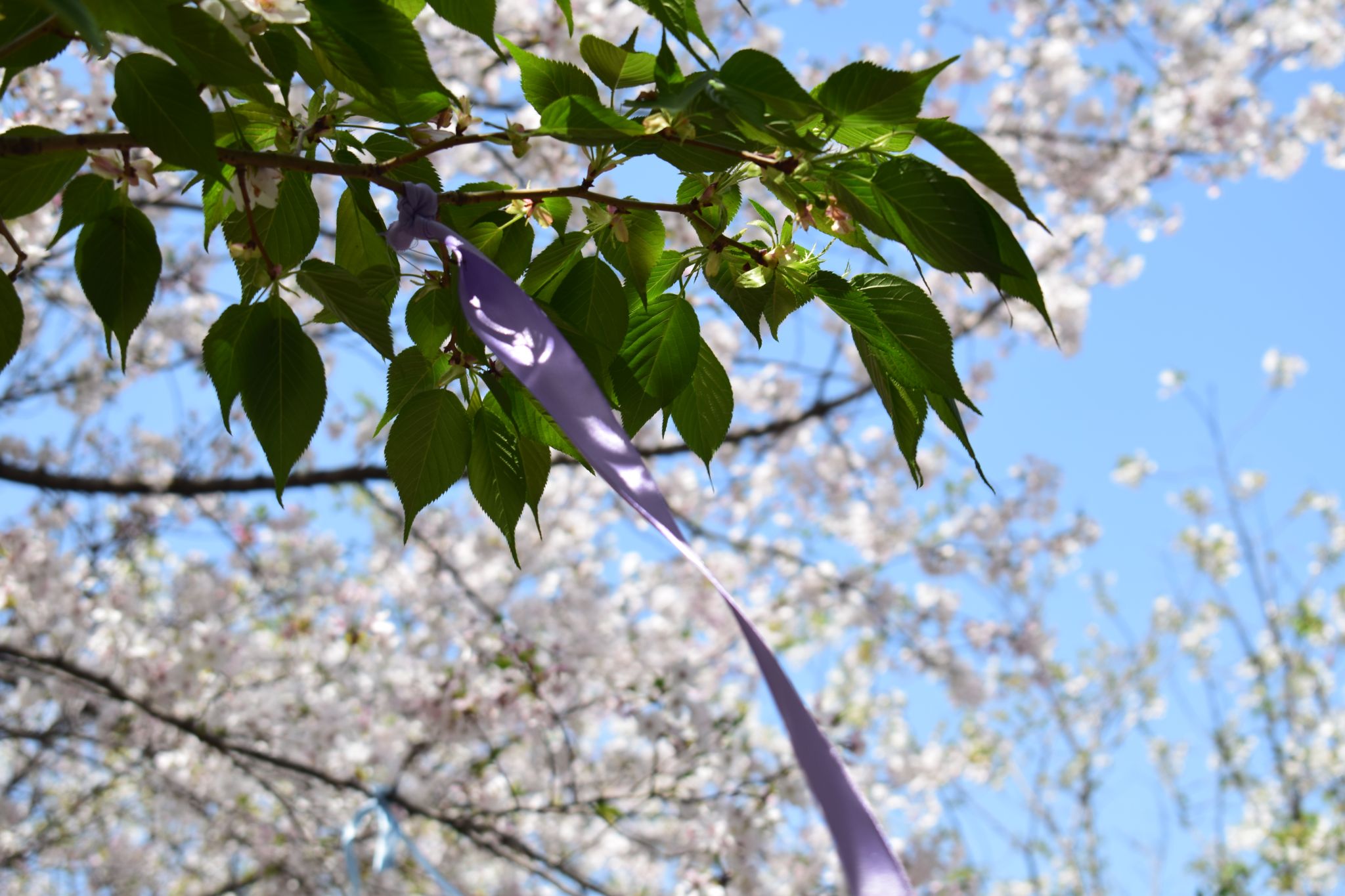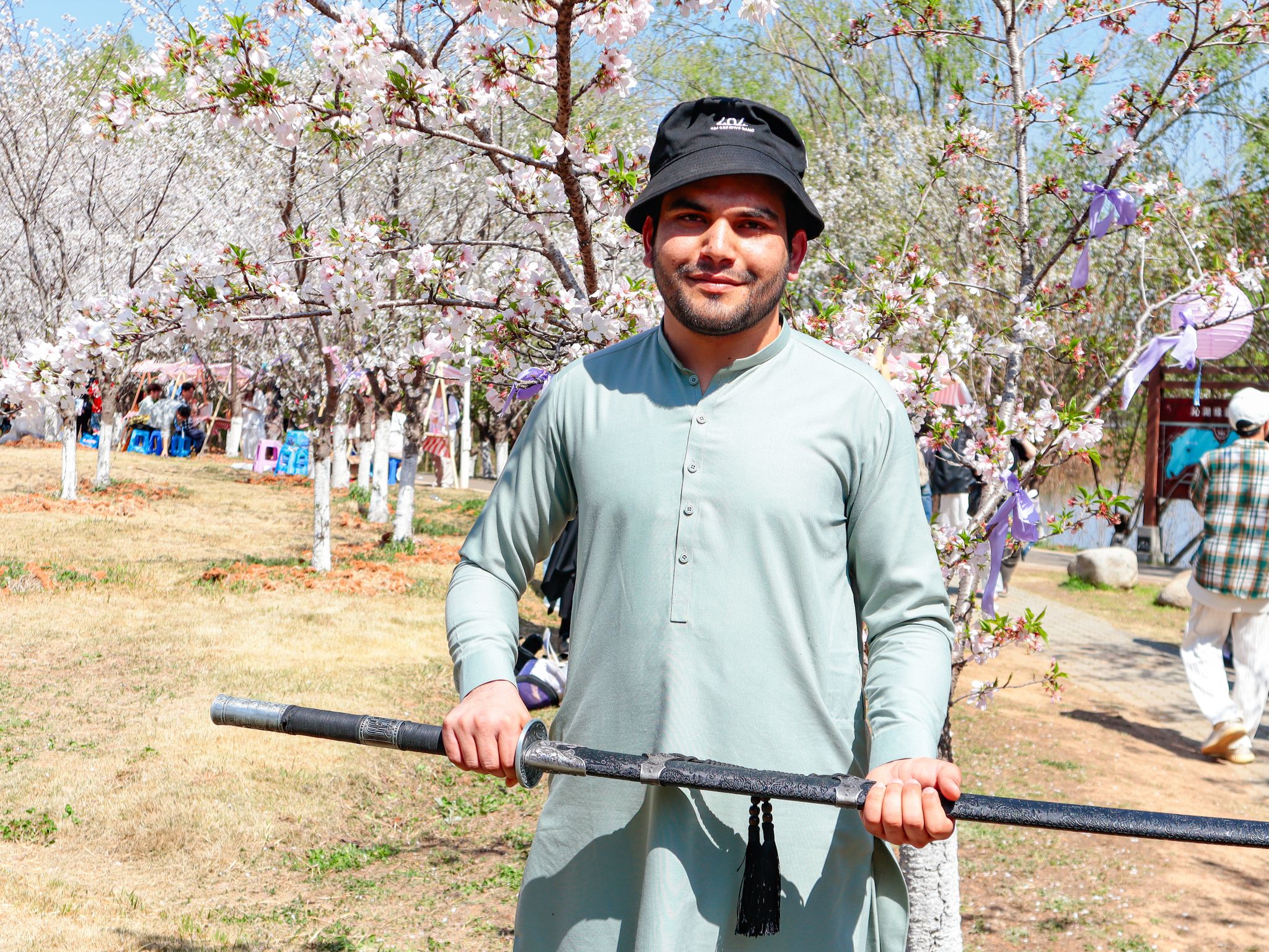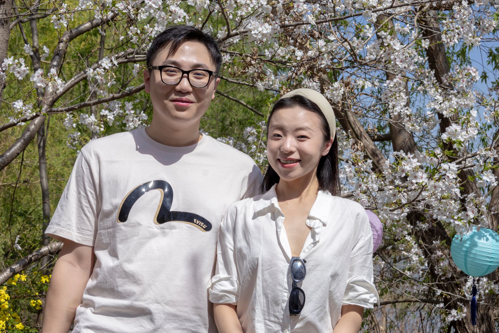 留学生柯海为樱花树系绸缎 王铭浩摄