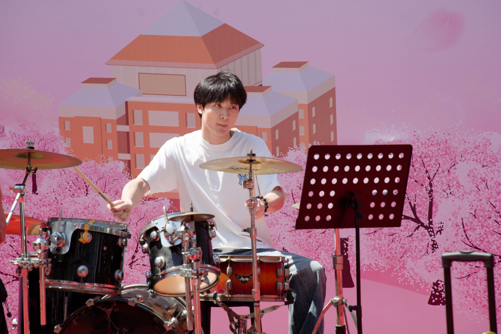 校团委书记王媛媛敲锣宣布樱花节开幕 陈楷林摄