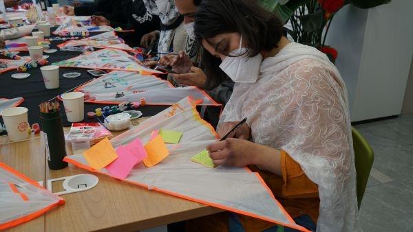 留学生在风筝下写上新年心愿。