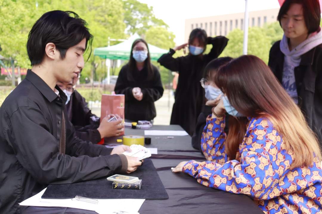 “你们看过《澳门风云》吗?其中坚哥可以透过指甲盖看到纸牌点数,其实我也可以。”说话间,协会副会长吉祥让围观的同学随机抽取了一张牌,并一眼就“看穿”是“方块4”。“你们抽的这张牌,一开始就是最底下被我记住的牌。我就是利用时间差与技巧,骗过了你们的眼睛。”吉祥现场解释道,“其实很多电信诈骗案例中,犯罪团伙主要也是利用‘时间差’来达到行骗目的。”