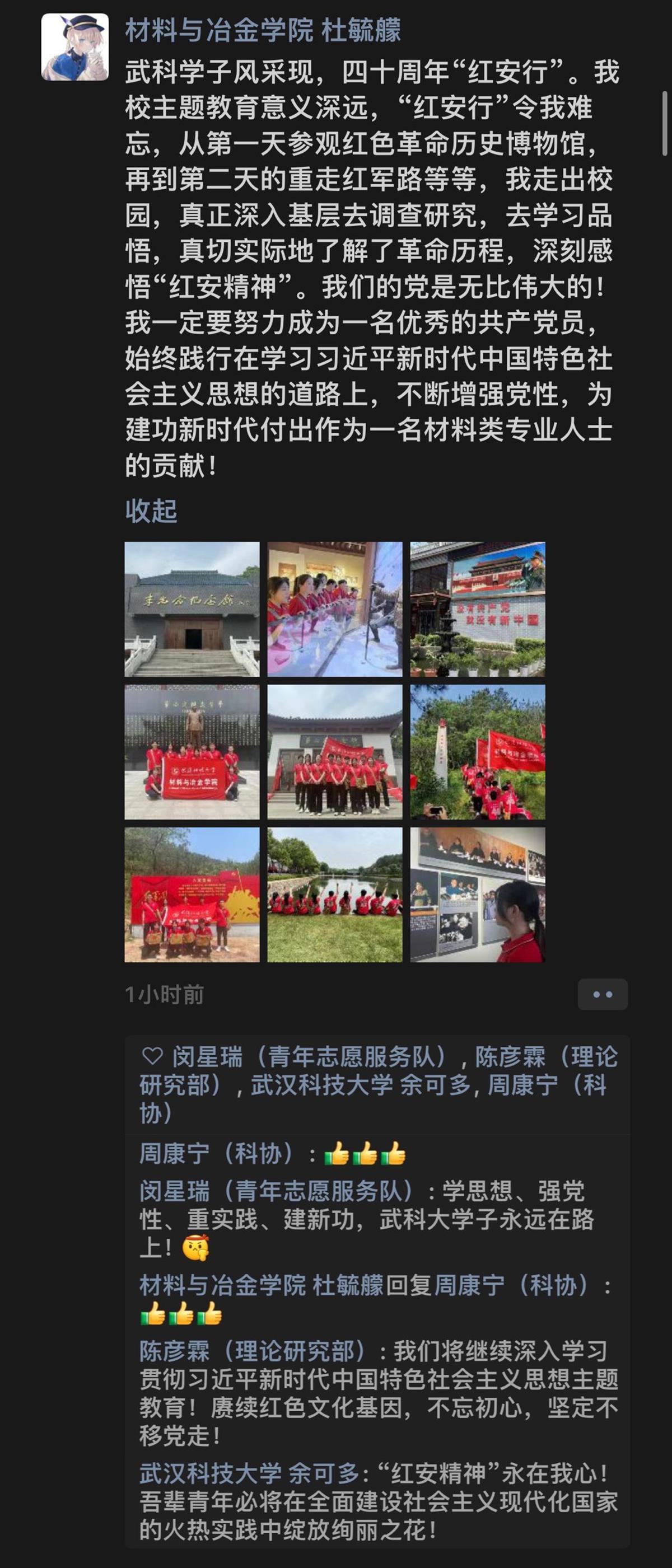 该校材料与冶金学院团委副书记杜毓艨在朋友圈分享了收获:“主题教育意义深远,我真切实际地了解了党的革命历程,深刻感悟了‘红安精神’。我们的党无比伟大!我一定要努力成为一名优秀的共产党员,始终践行在学习习近平新时代中国特色社会主义思想的道路上,不断增强党性,为建功新时代做出一名材料类专业人士的贡献!”同学们纷纷在下面留言点赞。