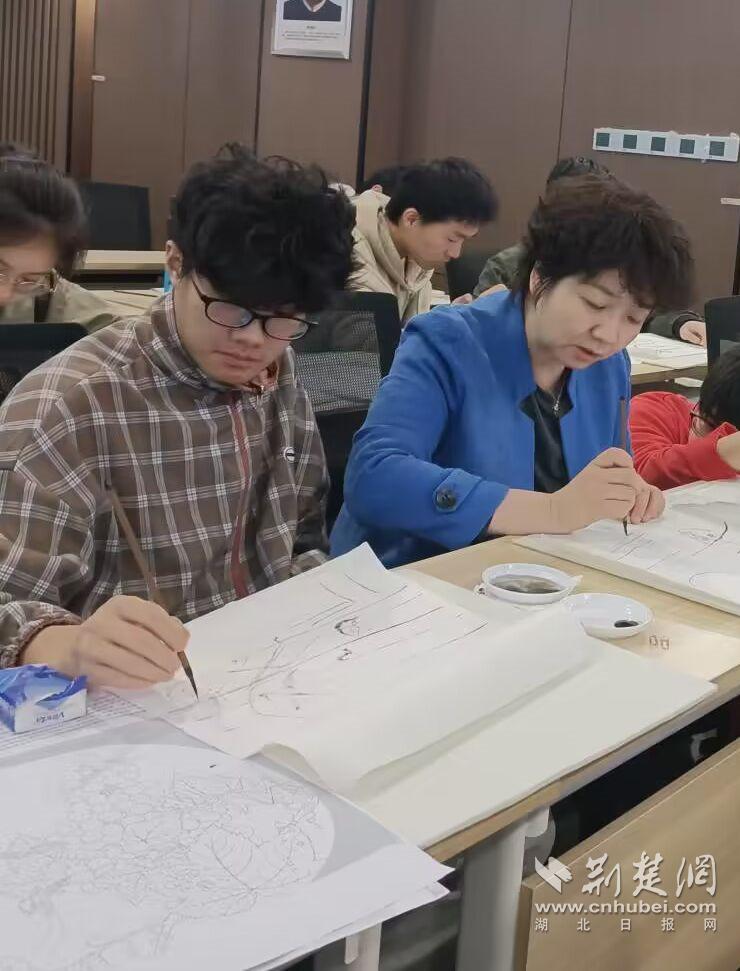 在绘画与公共艺术课上,来自艺术与设计学院的教授江澜给每位学生分发印有花鸟画的复印纸,让学生透过宣纸看到线条进行描绘。她给学生讲解作画的细节,指导学生完成作品。
