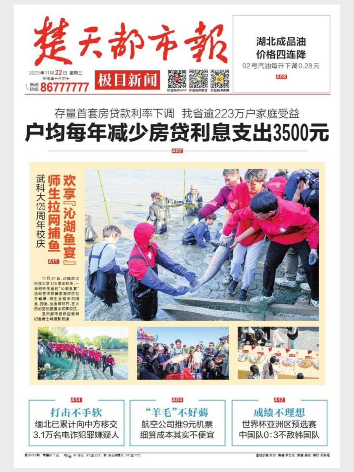 “大家加把劲,争取多捞一点,让每一位武科大人都吃上自家湖里的鱼!”上午8时许,随着一声“收网”,该校近百名师生开始在沁湖边拉纤,合力拉渔网,将其收拢至岸边。九时收网,一条条大鱼活蹦乱跳,16名身穿捕鱼套装的学生随即下水捕鱼。经过半小时的比拼,资源与环境工程学院学生张鑫捕了一条30.2斤重的大鱼,获得了今年的“捕鱼王”称号。他举着大鱼激动地说:“今年我要为学校125周年校庆献上这条最重的大鱼!”