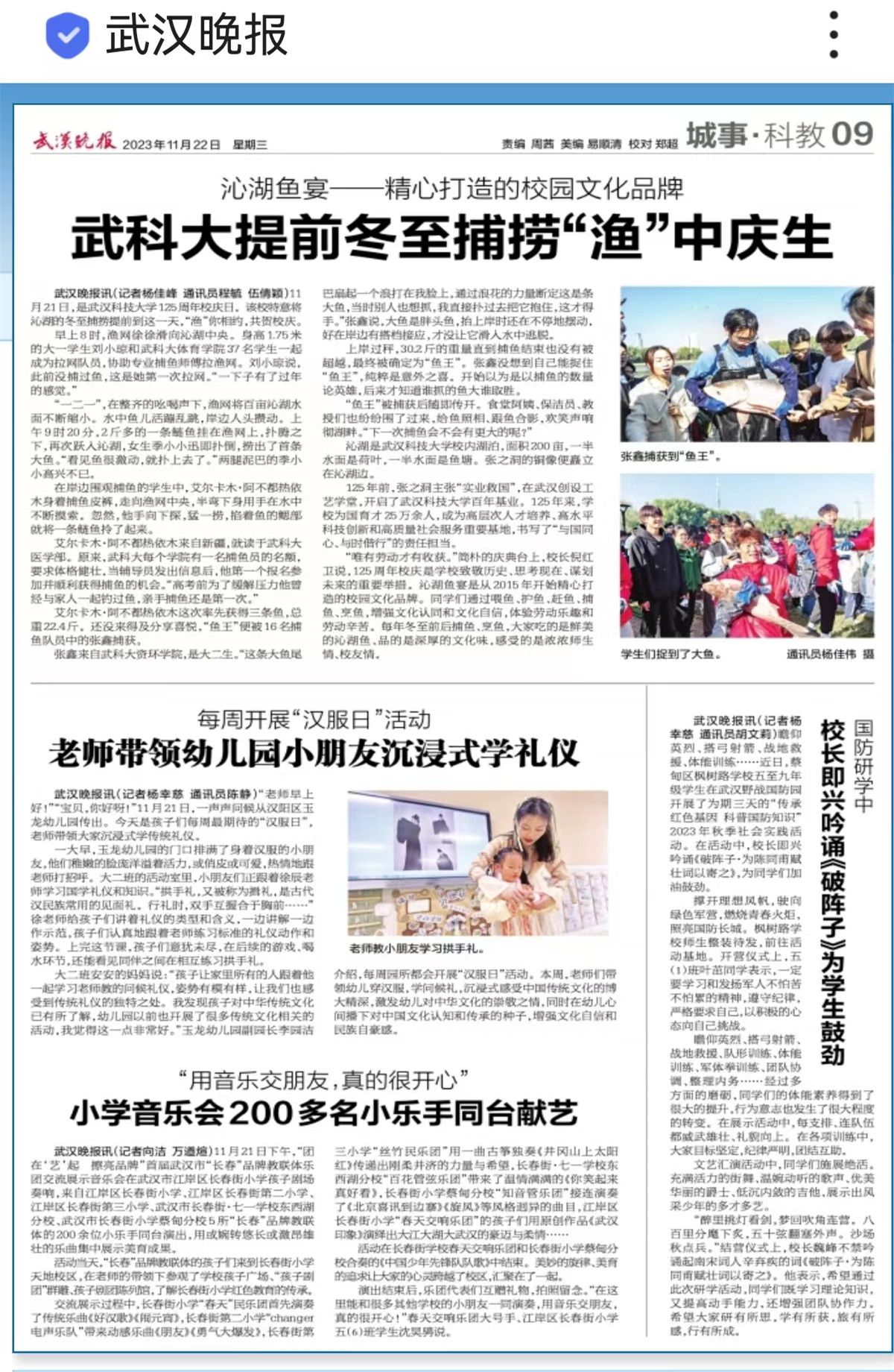 “鱼王”被捕获的消息随即传开。食堂阿姨、保洁员、教授们纷纷围了过来,给鱼照相跟鱼合影,欢笑声响彻湖畔。“下一次捕鱼会不会有更大的呢?”