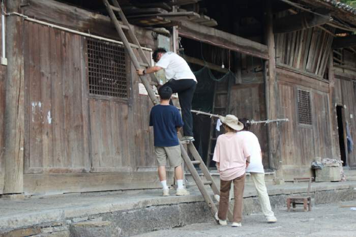 师生深入了解了舍米湖村的历史文化,利用航拍和全站仪测量了全村地形地貌,并对每户吊脚楼进行了测绘。2020级学生俞彤彤负责舍米湖村彭田路住宅的测绘工作,她发现吊脚楼实际建造并不是书本上那样标准化,而是因地制宜的。为了更好地了解木头穿插结构,他们搭梯子爬上阁楼进行测量。调研组学生郭可心根据调研成果撰写了题为《舍米湖村传统聚落景观形态特征研究》的论文。