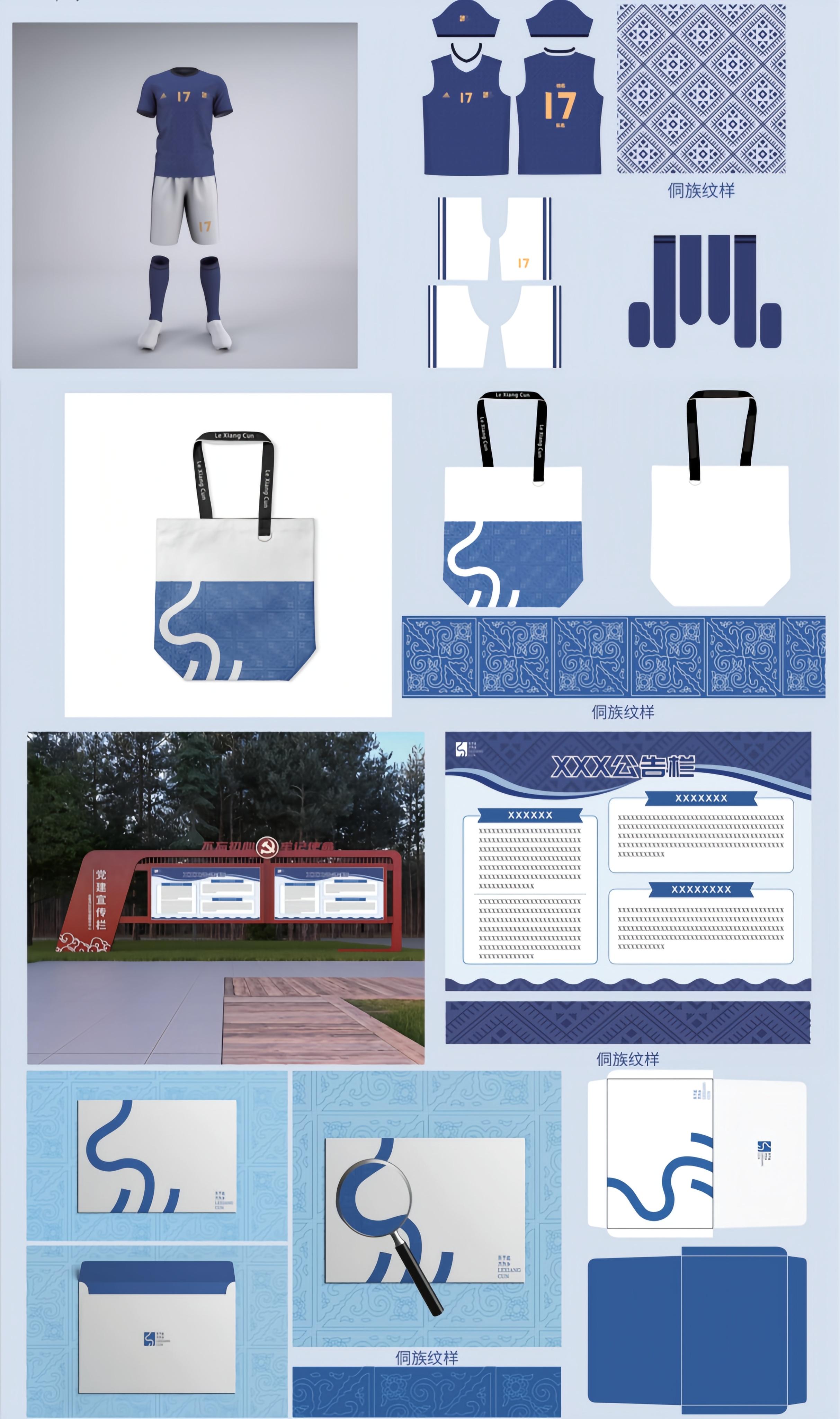 “‘logo’、旗帜和队服还不够,印章、帆布袋、信封、公告栏这些也不能少。”他们从去年七月开始,直至过年前后也在熬夜设计,最终结合乐乡村地域文化特色设计出20套方案,经过小组头脑风暴后选定5套方案供当地选择,乐乡村最终选择了包含当地侗族非遗“蓝染”和乐乡村地域元素的方案。