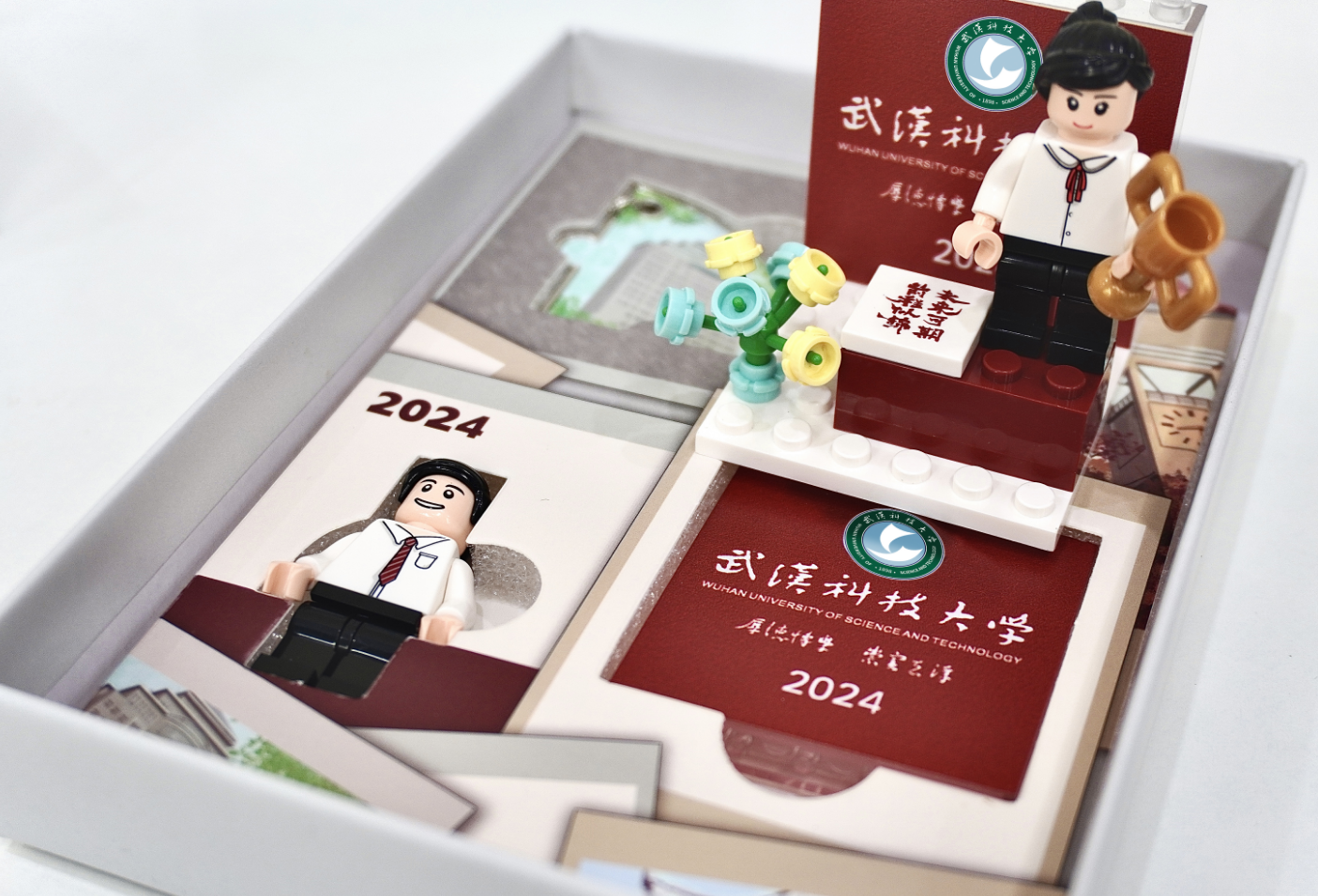 该校将标志性建筑作为设计元素,制作了镌刻有“春樱”“夏叶”“秋枫”“冬雪”四种景色的钥匙扣盲盒。榫卯结构的设计让钥匙扣亦可两两合一。同时还有趣味积木玩具,其主体人物在繁花中手捧着奖杯,背景板印着校徽、校训与寄语。礼物以盲盒形式发放,每份刻有毕业生的姓名和学号,是专属的“盲盒礼物”。