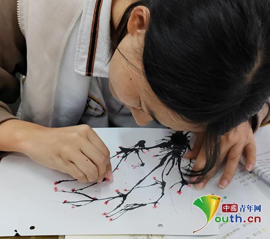 讲解结束后,学生们迫不及待地将墨汁滴到纸上,用吸管或笔筒等工具将墨汁吹出梅花的枝干,然后用红色彩笔、粉笔等点上梅花花瓣,一株株形态各异的梅花树跃然纸上。(记者 李彦龙 通讯员 徐继男)