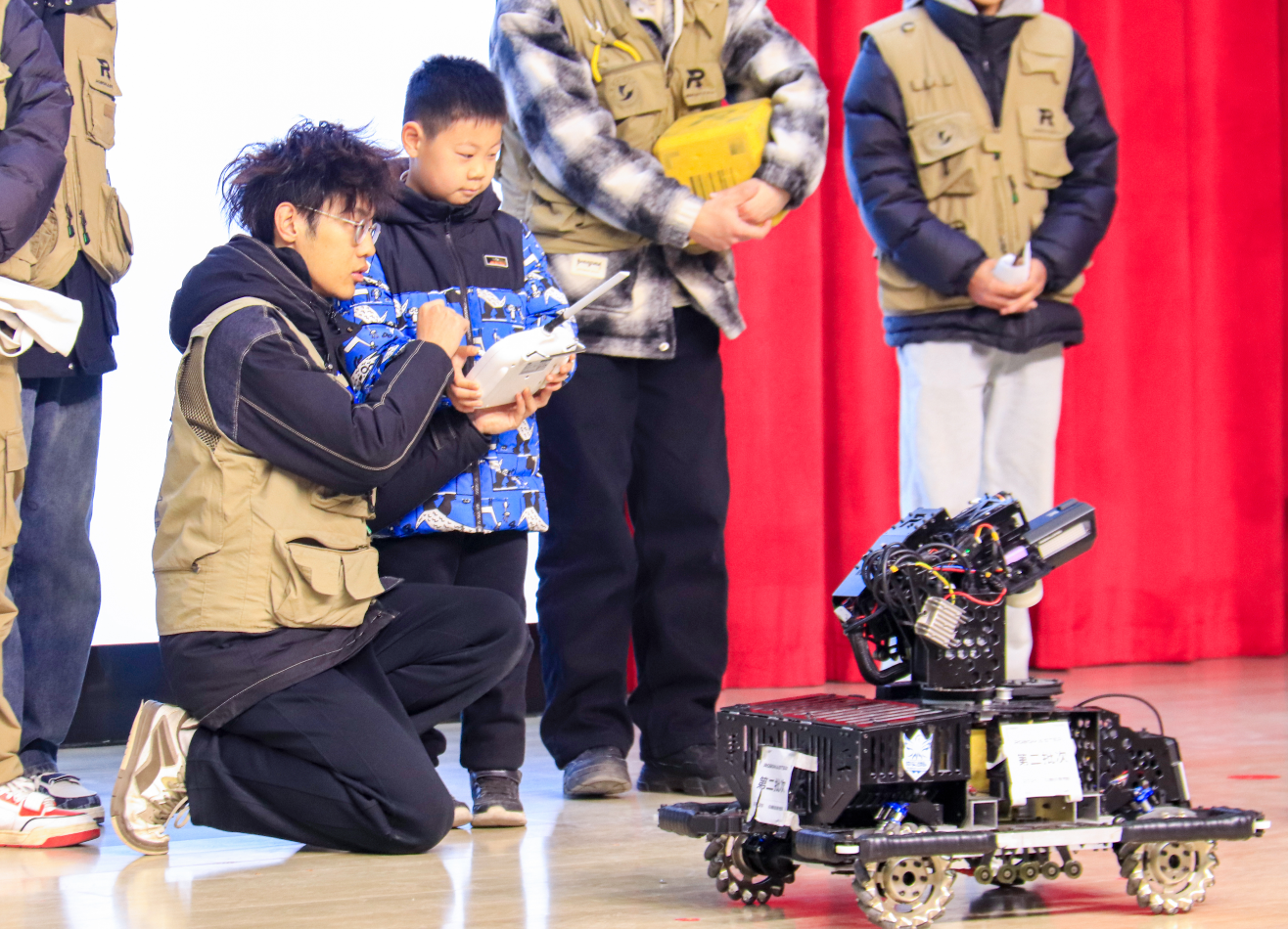 “机器人是如何像人一样抓取物体的?”“如何让机器人的‘胳膊’‘关节’运转起来?”战队成员周天浩将机器的各部分与人体的胳膊、皮肤类比起来,解释了“英雄”和“工程”机器人的运行逻辑。“机器的‘胳膊’可以调整机械臂的长度,机械的感知就跟人体皮肤的触觉一样,机器能够感受人体左手和右手合在一起的‘感觉’。”现场演示了机器人360度旋转、弹丸发射、直线运行等操作流程。107班学生王悠然在志愿者的引导下,缓慢拨起旋钮,机器人便轻盈着移动起来,引发在场学生阵阵惊呼。“真有趣!我在机器人课程上学习了相关内容,这次操作让我有进一步学习的动力!”他感叹道。
