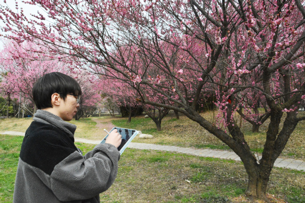 看到网上不少学生晒出学校梅花盛开的场景,对绘画略感兴趣的大二学生秦浩轩也来到了梅园,利用Procreate勾画简笔画描绘了这一美景。以前我都是用底画照片进行描摹,这是第一次尝试户外写生,这也算是文化传承的一种方式吧。 秦浩轩说。