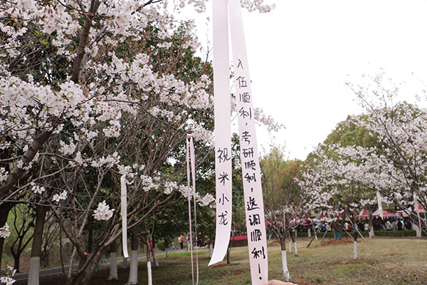 “四级一次过过过”“万事胜意 平安喜乐”“希望家人身体健康 平安顺遂”樱花大道的两侧,写满祝福祈愿的彩带吸睛无数。我校退休职工张炳刚将写着“希望武科大早日成为双一流”祝福的彩带挂上花枝。“樱花节办得很盛大,重返校园让我的心情很愉快。”张炳刚说。