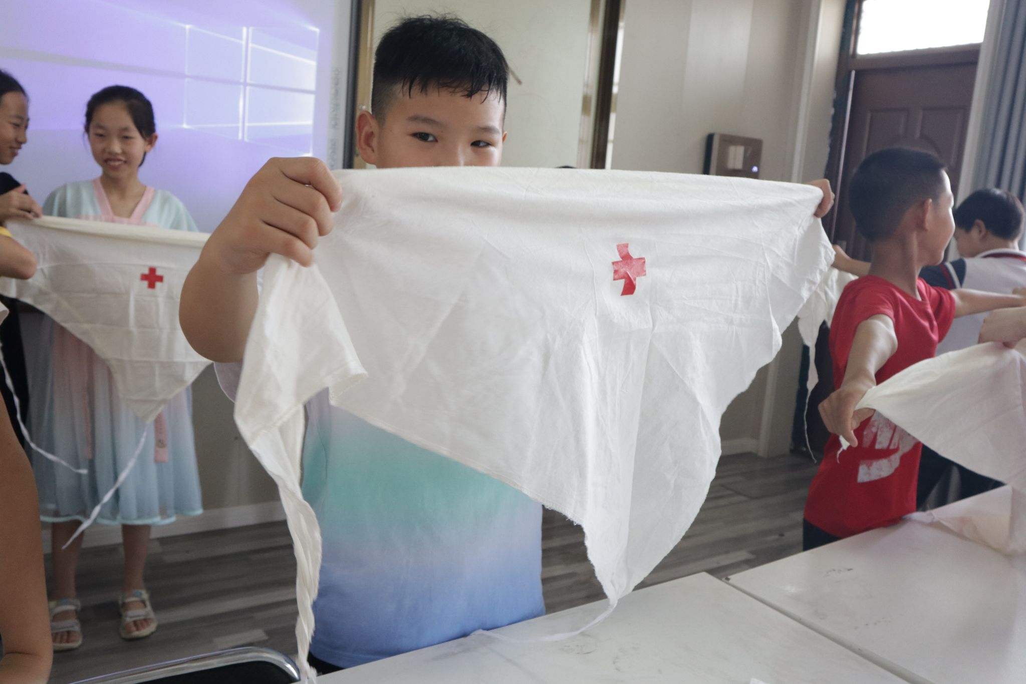 在接下来的动手包扎环节,小朋友们被分为八组互相练习三角巾的头部包扎方法。“齐眉漏耳,枕后交叉,虎口加压……”学生们嘴里不断重复着包扎口诀,手中反复练习着三角巾包扎。“这是我第一次教小朋友们急救知识,开始之前还挺担心会冷场,但是看到大家都很热情活泼并积极配合教学,我很高兴。”向冰清笑着说道。
