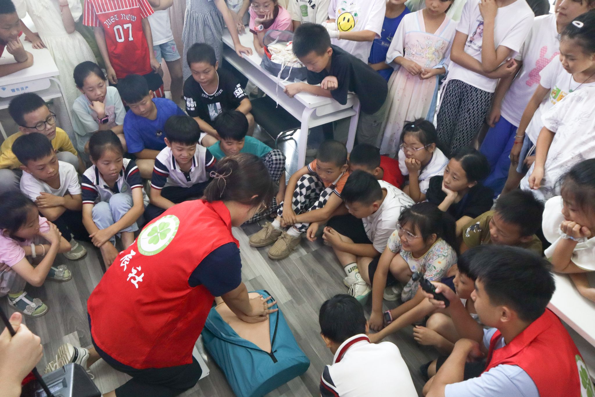 “我们进行心肺复苏之前一定要打120并寻找附近的AED,按压的位置和深度都要掌握好,这样才能提高抢救的成功率。”来自临床2207班的向冰清讲解道,同时临床2203班李桂怡用模拟人演示,小朋友们目不转睛地盯着主讲人的操作,不少后排的学生举手表示想要到前面观摩学习。