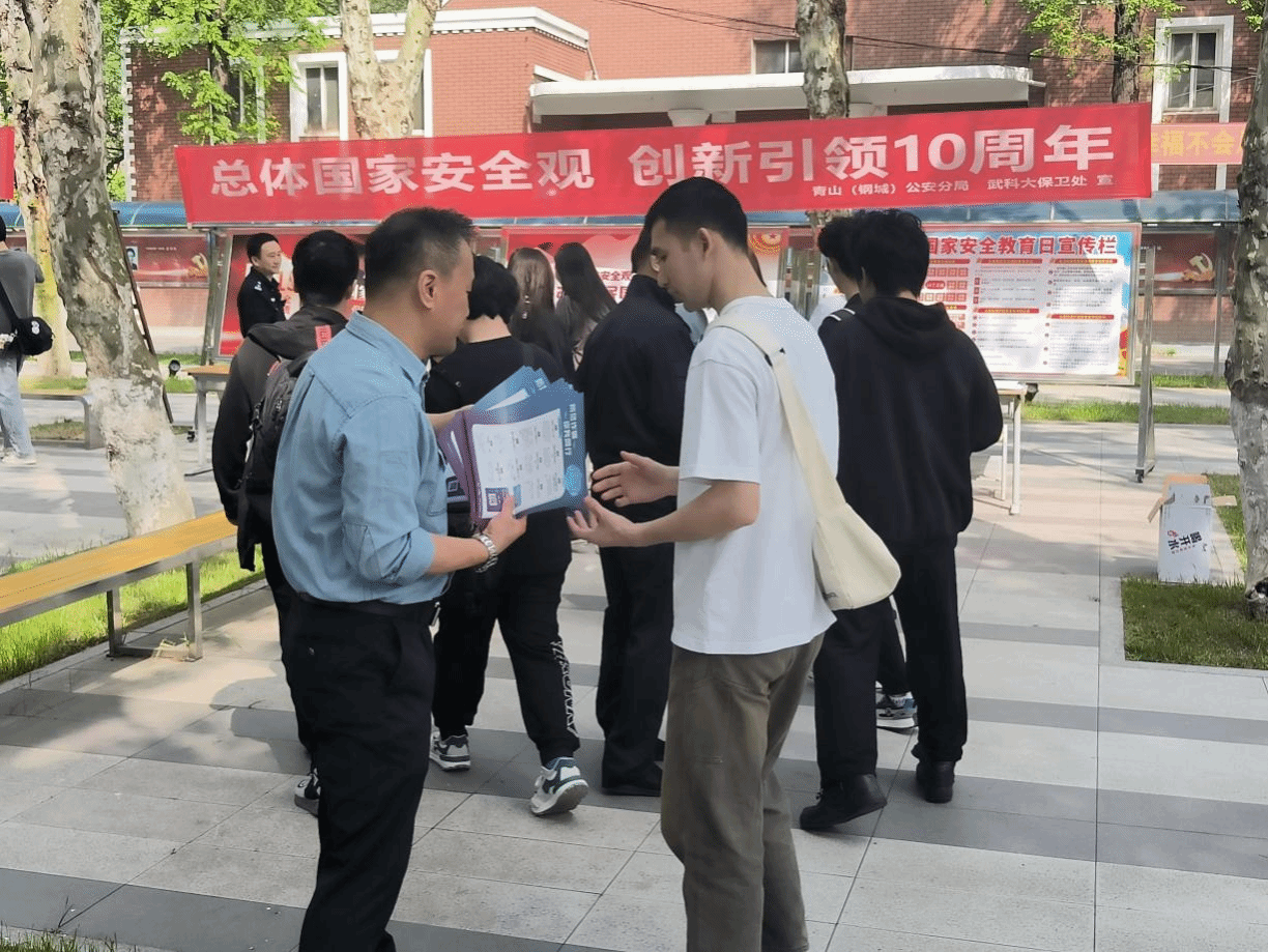 武科大网讯(通讯员孙勇军 黄世军)今年是习近平总书记总体国家安全观提出10周年,4月15日是第九个全民国家安全教育日。为进一步普及国家安全知识,营造“国家安全,人人有责”的浓厚社会氛围,筑牢维护国家安全和社会政治稳定的思想基础,4月15日上午,保卫处联合武汉市公安局青山(钢城)分局开展以“总体国家安全观,创新引领10周年”为主题的国家安全观宣传教育活动。