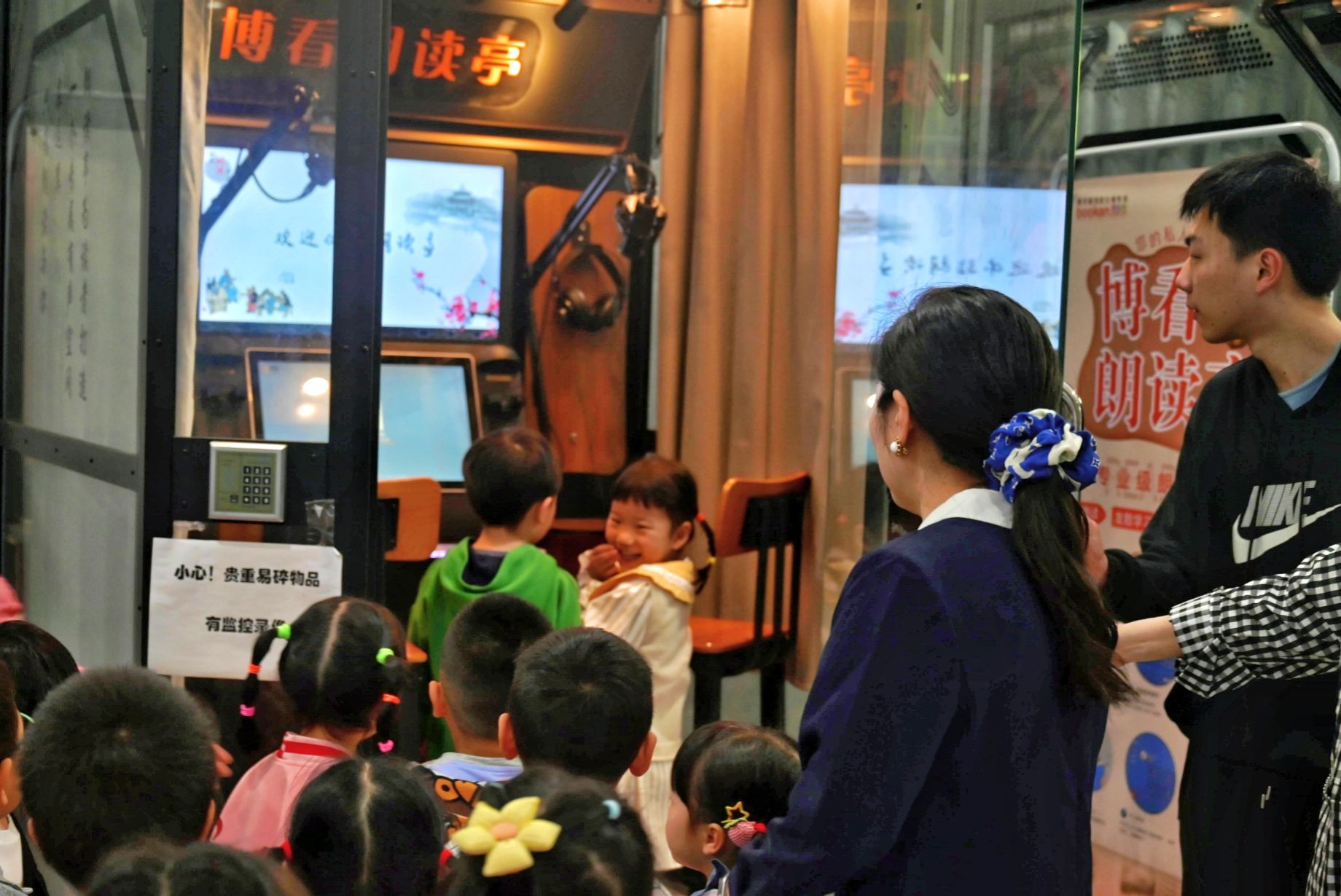 途经二楼阅览室时,小朋友们对单独设置在一楼拐角的朗读亭表示好奇,宛佳详介绍道:“朗读亭里有专业麦克、耳机、触摸点播系统、座椅、小吧台等,集成一套完整的录音设备,朗读者在一个不受干扰的密闭安静空间里可以尽情朗读中外名著、红色精典文章、唐诗宋词元曲等内容。”在宛佳详和带队老师的组织下,小朋友以两人一组分批进入朗读亭。在外等候的学生听到了朗读亭内微弱的声响,对宛佳详的讲解有了更深刻的认识。