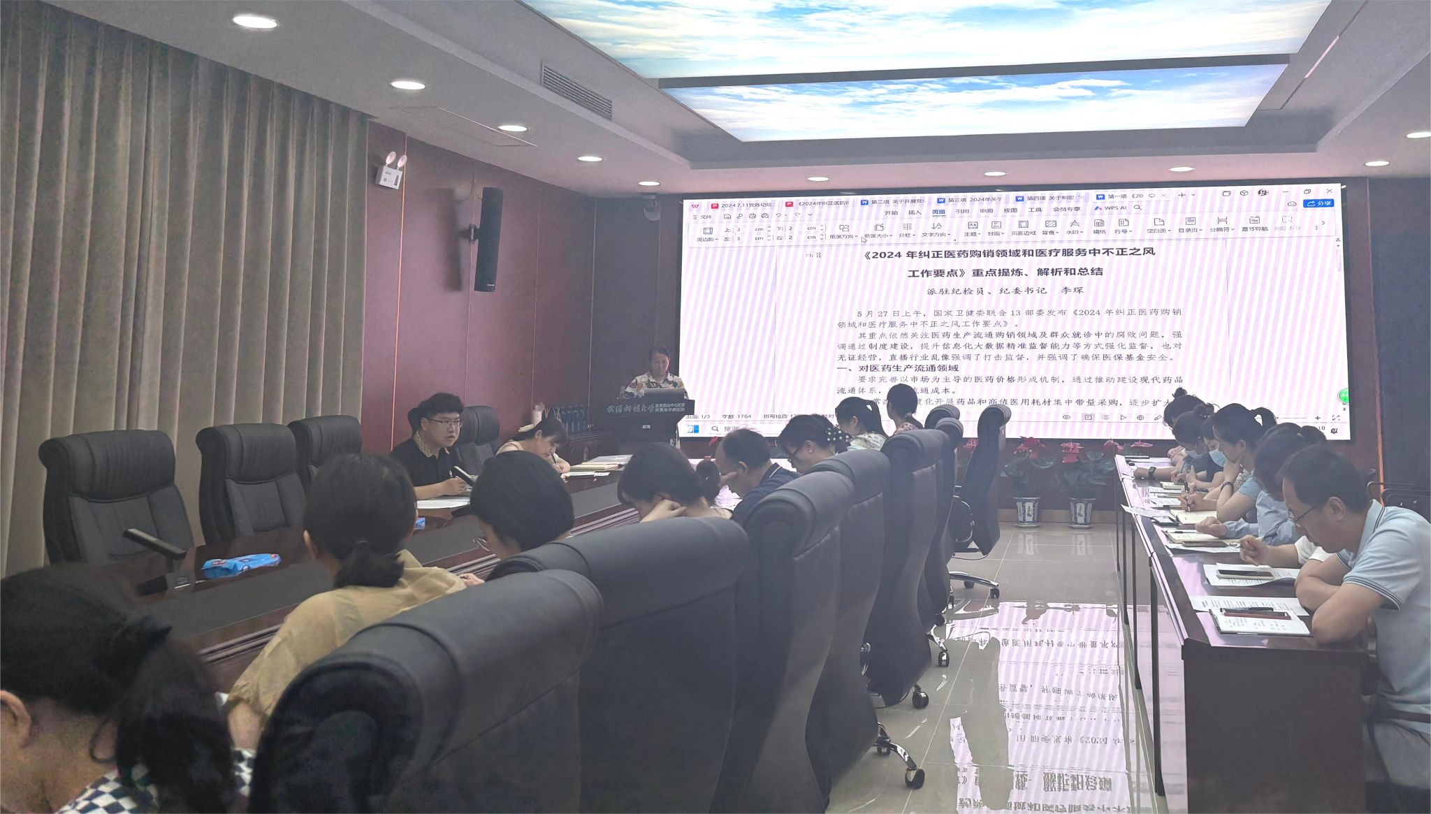院纪委书记李琛代表医院党委汇报医院党纪学习教育开展情况阶段性总结,解析和宣贯国家卫健委联合13部委发布的《2024年纠正医药购销领域和医疗服务中不正之风工作要点》,传达、领学学校《关于开展党纪学习教育全而查找违纪风险点工作的通知》《2024年关于深化廉政风险防控工作的通知》《关于制定“小微权力”清单工作的通知》等工作精神及要求,并对下一步工作进行详细的部署,并以校内外党纪学习教育典型案件为例,对党支部书记、委员和各职能科室负责人等进行集中廉政谈话。