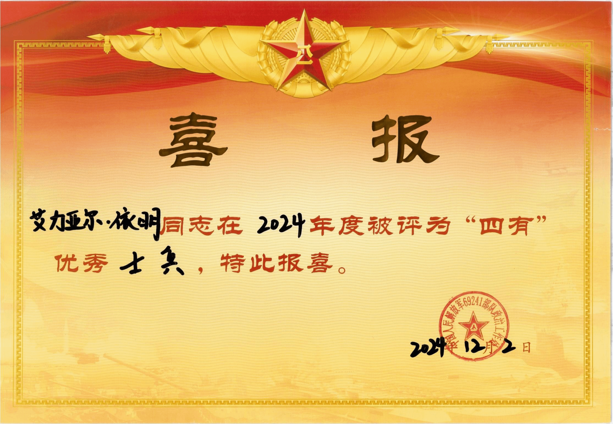 武科大网讯(通讯员胡兆刚)岁末年初,从青山区人民武装部传来喜讯:我校2023年入伍的四名学生被所属军兵种单位评为2024年度“四有”优秀士兵。他们分别是:物流工程1902班徐凯,国际经济与贸易2101班徐钰茹,;矿物加工工程2102班艾力亚尔·依明;以及能源与动力1901班刘伟林。