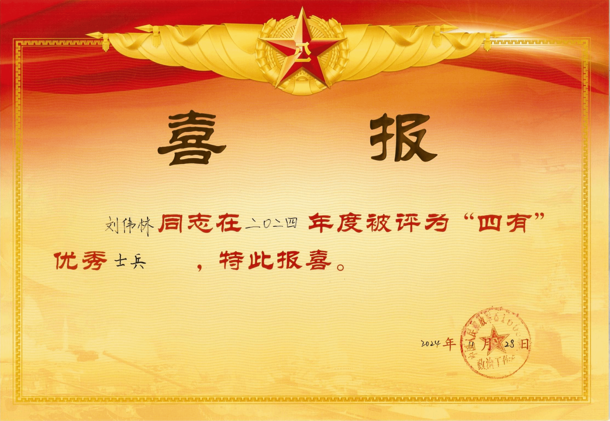 四有”优秀士兵是由部队评选,颁发由中央军委统一规范的奖状、证章、证书,并使用军队喜报专递信封寄发喜报的年度荣誉。“四有”优秀士兵的获得证明了该同学参军入伍后,将我校“坚韧不拔、勇承重载,崇实求精、表里如一”的钢铁品质,应用到部队军事训练、政治学习与日常工作中,成长为“有灵魂、有本事、有血性、有品德”的优秀中国军人。四名同学的突出表现,充分展现了我校人才培养的卓越成效和集成效应,必将激励着更多的学生投身国防建设,为实现强军目标贡献青春力量。