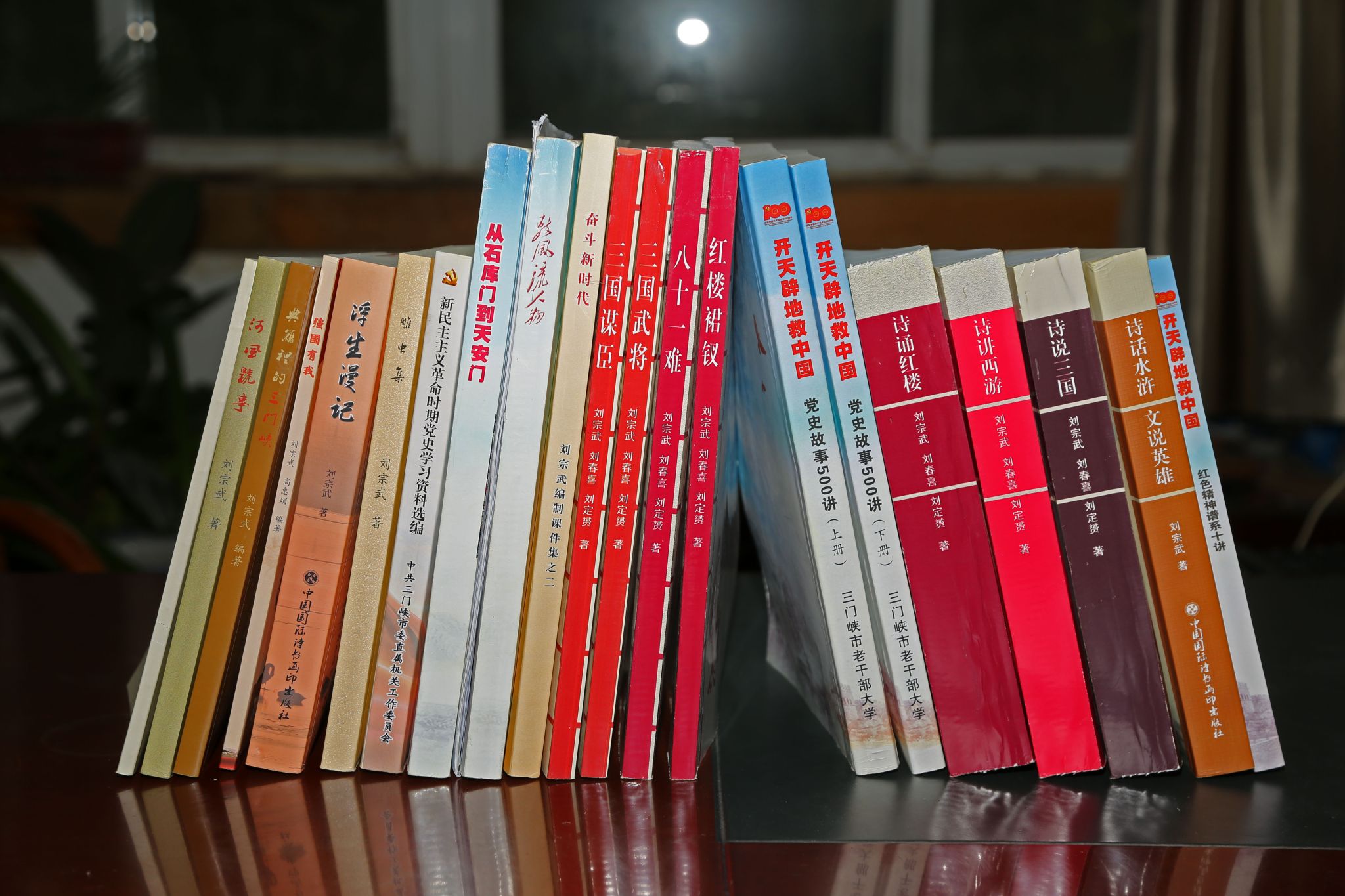 在机械工程学院办公室的桌子上,摆放着20多本书,有关于四大名著的丛书《诗话水浒》《诗说三国》《诗讲西游》《诗诵红楼》,有讲红色故事的丛书《开天辟地救中国》《数风流人物》《强国有我》,还有个人传记《浮生漫记》。